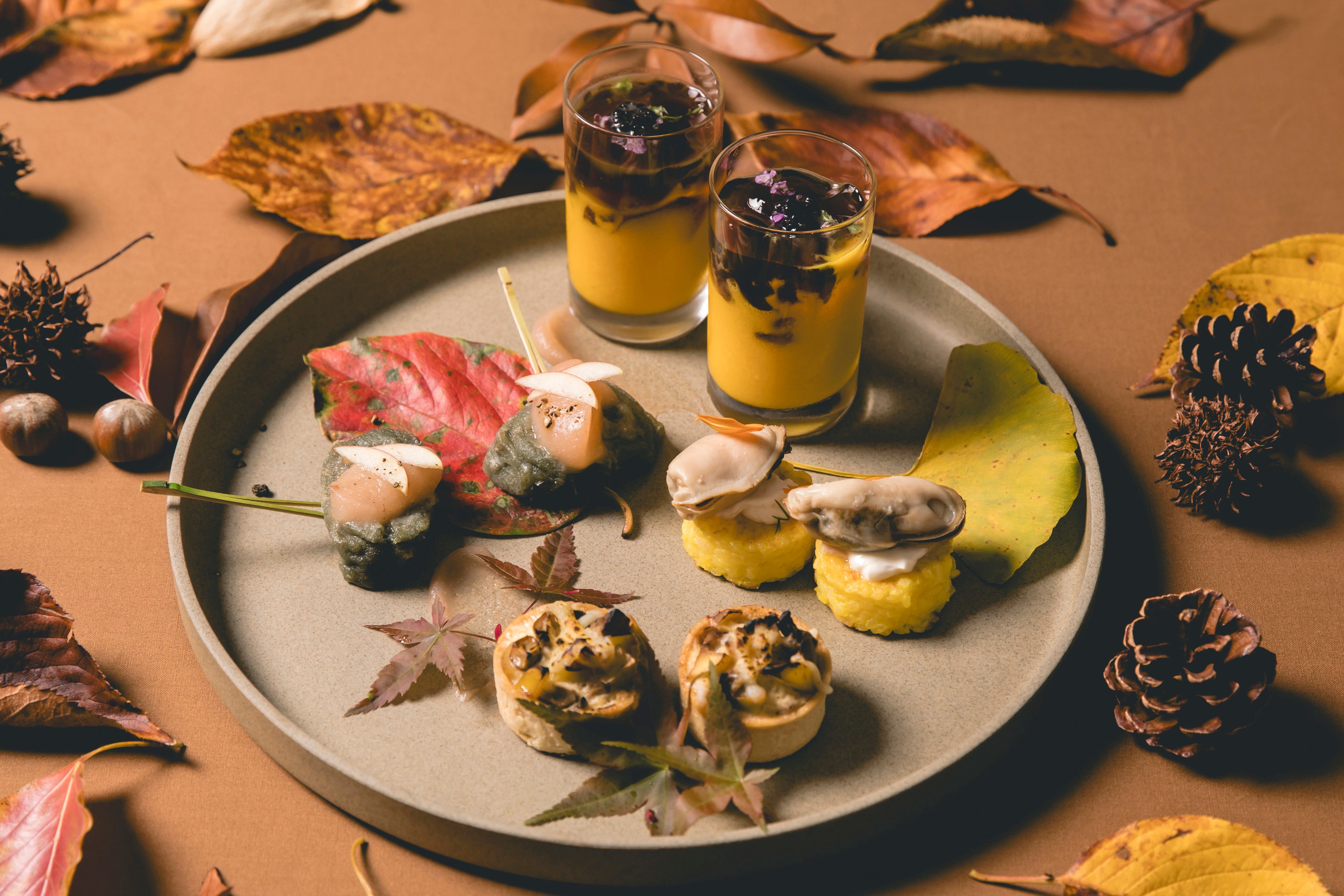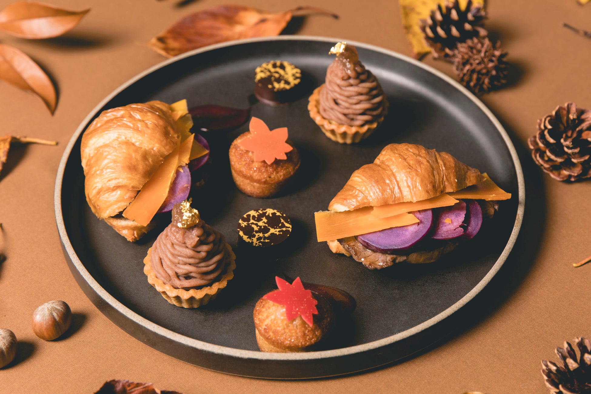 デザートには秋の実りを感じるモンブランタルト、洋梨のヴェリーヌ、メープルフィナンシェなどのスイーツが勢ぞろい。セイヴォリーにはポルチーニと焼き栗のキッシュ、さつまいもとラム肉のクロワッサンサンド、ラングスティーヌと南瓜のコンソメジュレといったシェフのオリジナリティ溢れる秋の味覚が満載のメニューも豊富に揃います。
