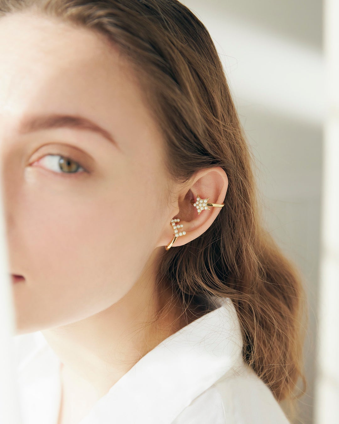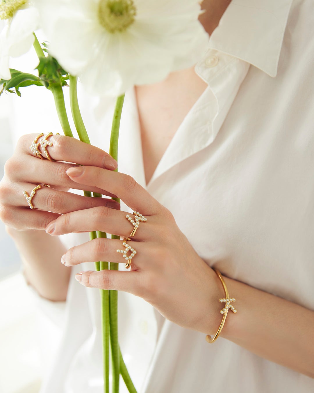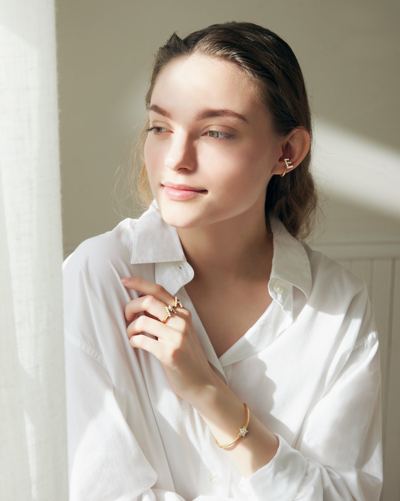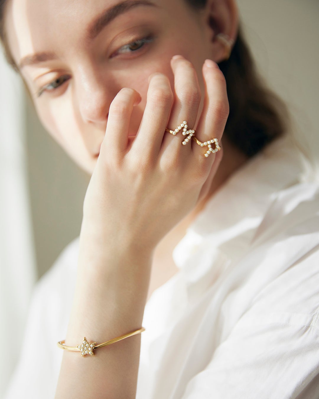 イヤーカフ、バングルともにA.C.E.H.K.M.N.R.S.Yのアルファベットと希望を象徴するスターモチーフの、合計11モチーフを展開。自分や大切な人のイニシャルはもちろん、Amulet(お守り)のAやHappiness(幸せ)のHなど、ポジティブなメッセージを表現することもできます。イヤーカフはリングとしても着用でき、装いや気分に合わせて様々なコーディネートが可能です。