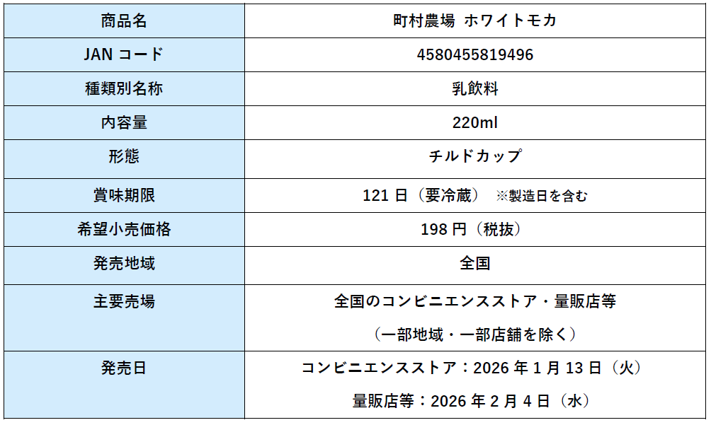 トーヨービバレッジ株式会社(本社:東京都渋谷区、代表取締役社長:熊谷聡)は町村農場の練乳を使用した「ホワイトモカ」を2026年1月13日(火)より全国のコンビニエンスストアにて順次発売いたします(一部地域・一部店舗を除く)。