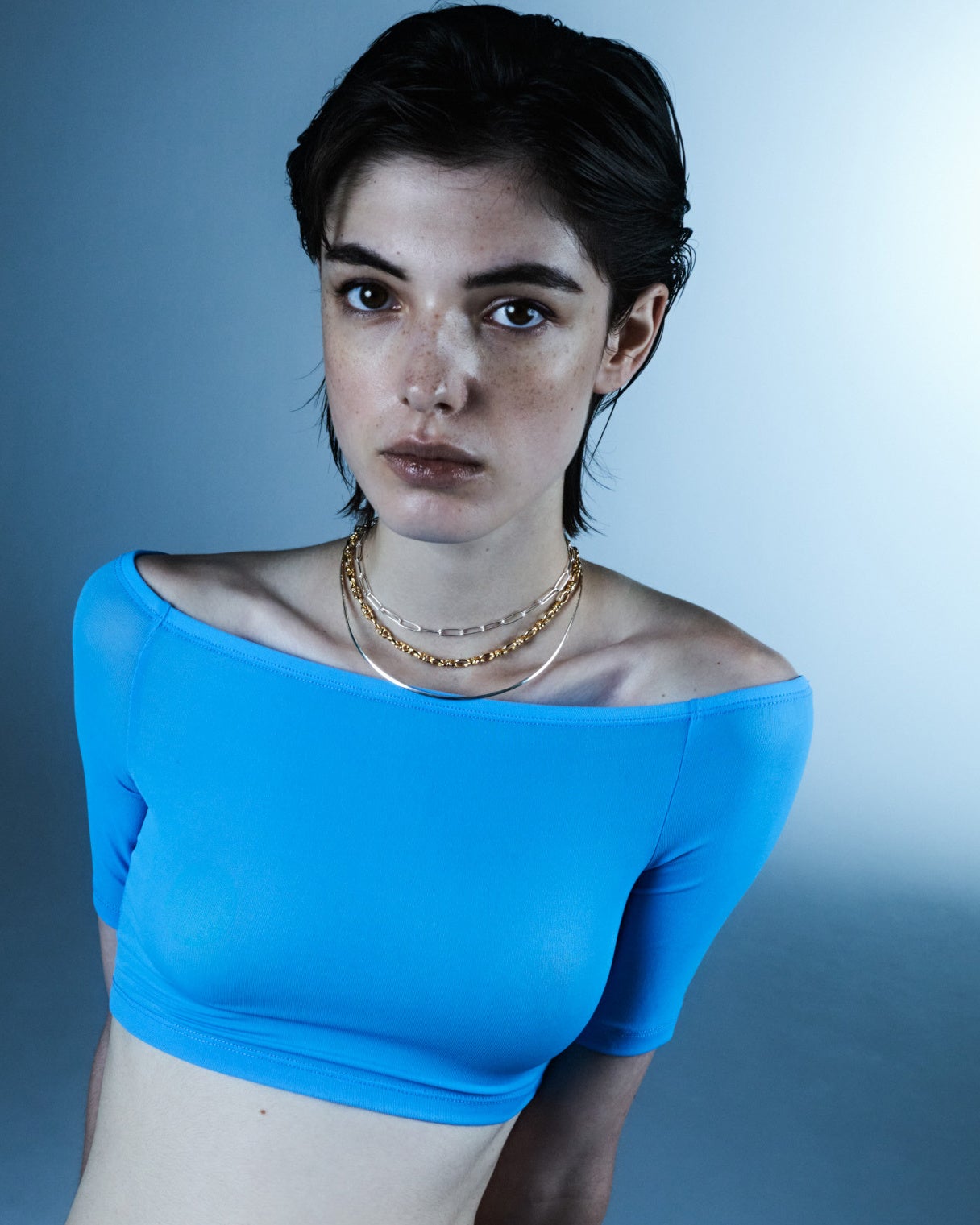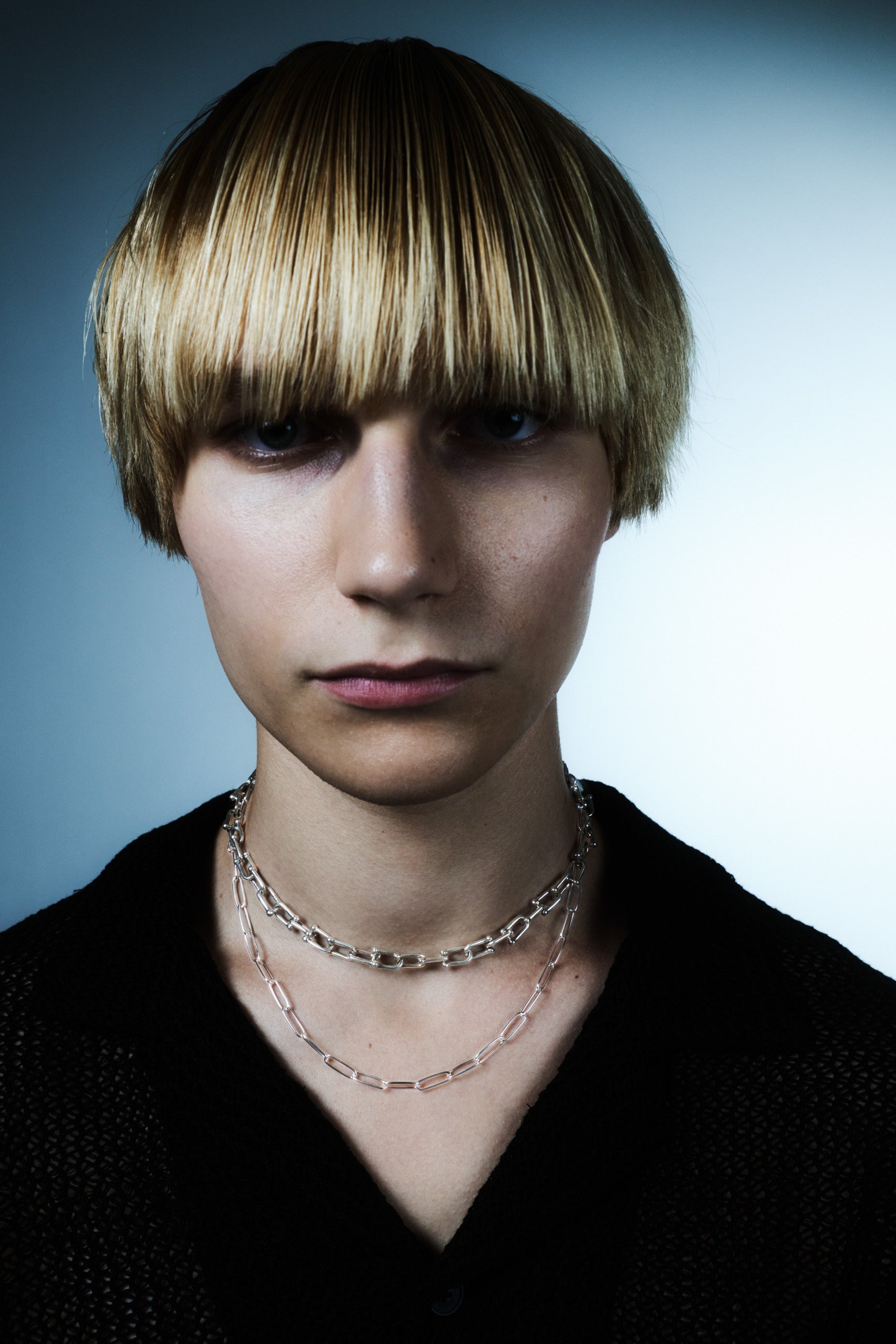 抜けのあるシルバーチェーンが光を反射して、エッジィでモダンな横顔を演出します。