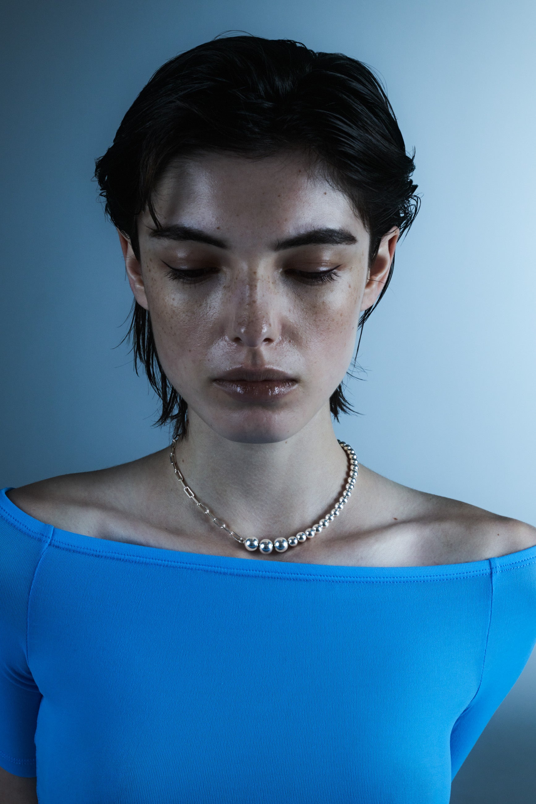 シルバーボールとチェーンを合わせたアシンメトリーネックレス。