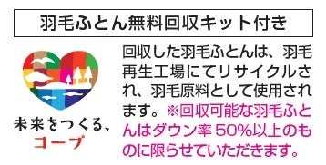 このアイコンのついた商品は、「くらしと生協」の持続可能な社会・世界を応援する取り組みや笑顔のあふれる未来につながる活動に関わる商品であり、羽毛ふとん無料回収キット付き対象商品になります。