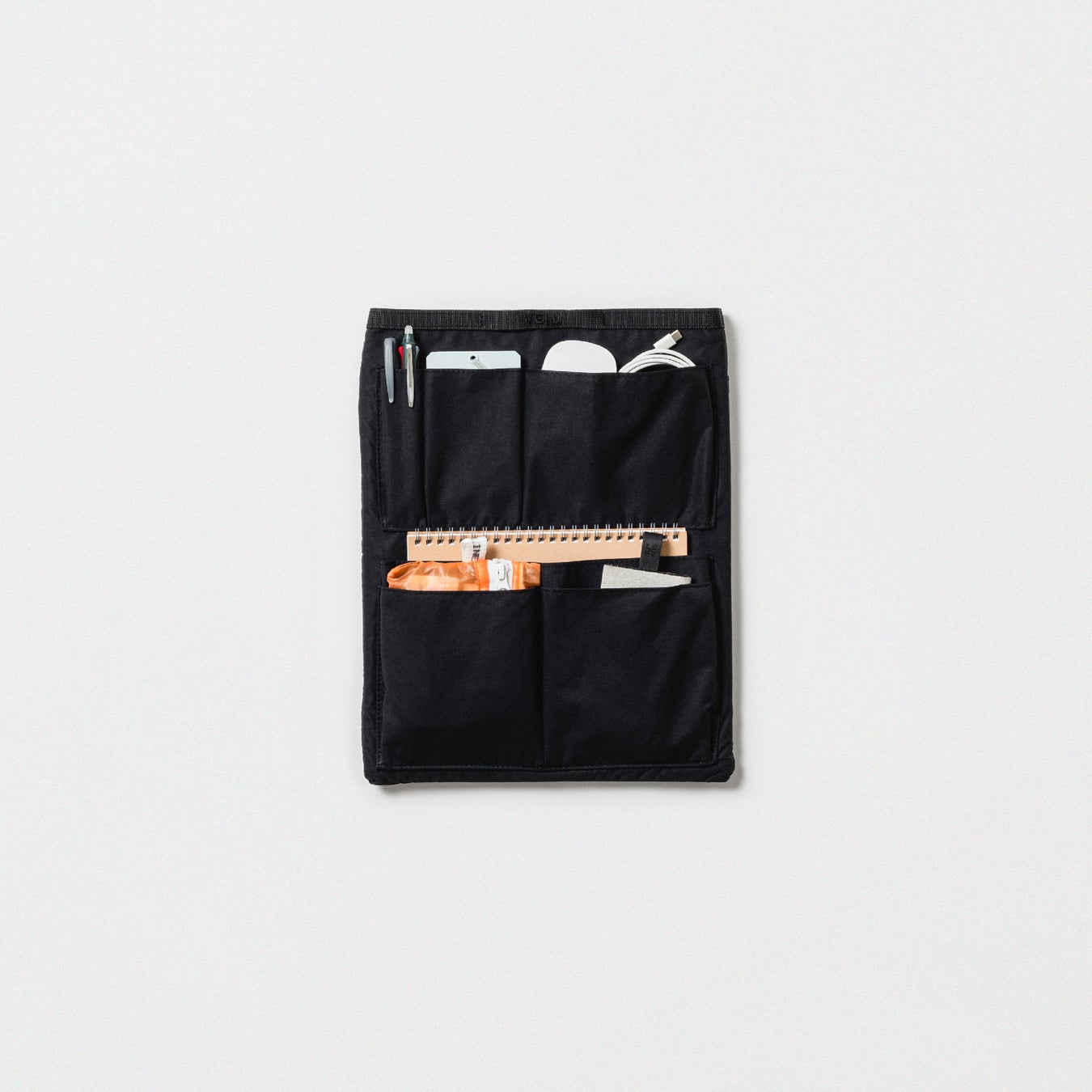 クッション材でPCなどの機器を保護しつつ、バッグの芯材としても機能します。PCが入るメインのポケットの他に、裏表に配置された小分けのポケットにも小物を入れることができ、バッグの中で収納をサポートしてくれます。