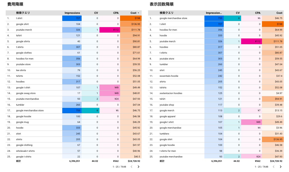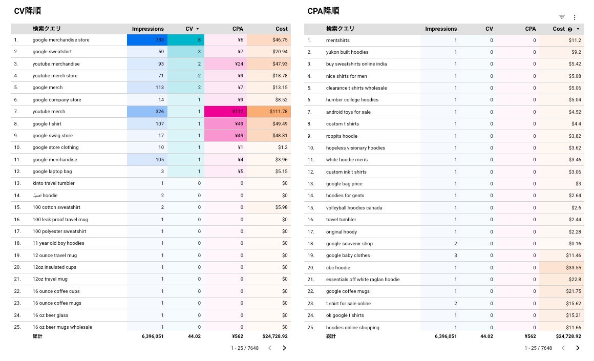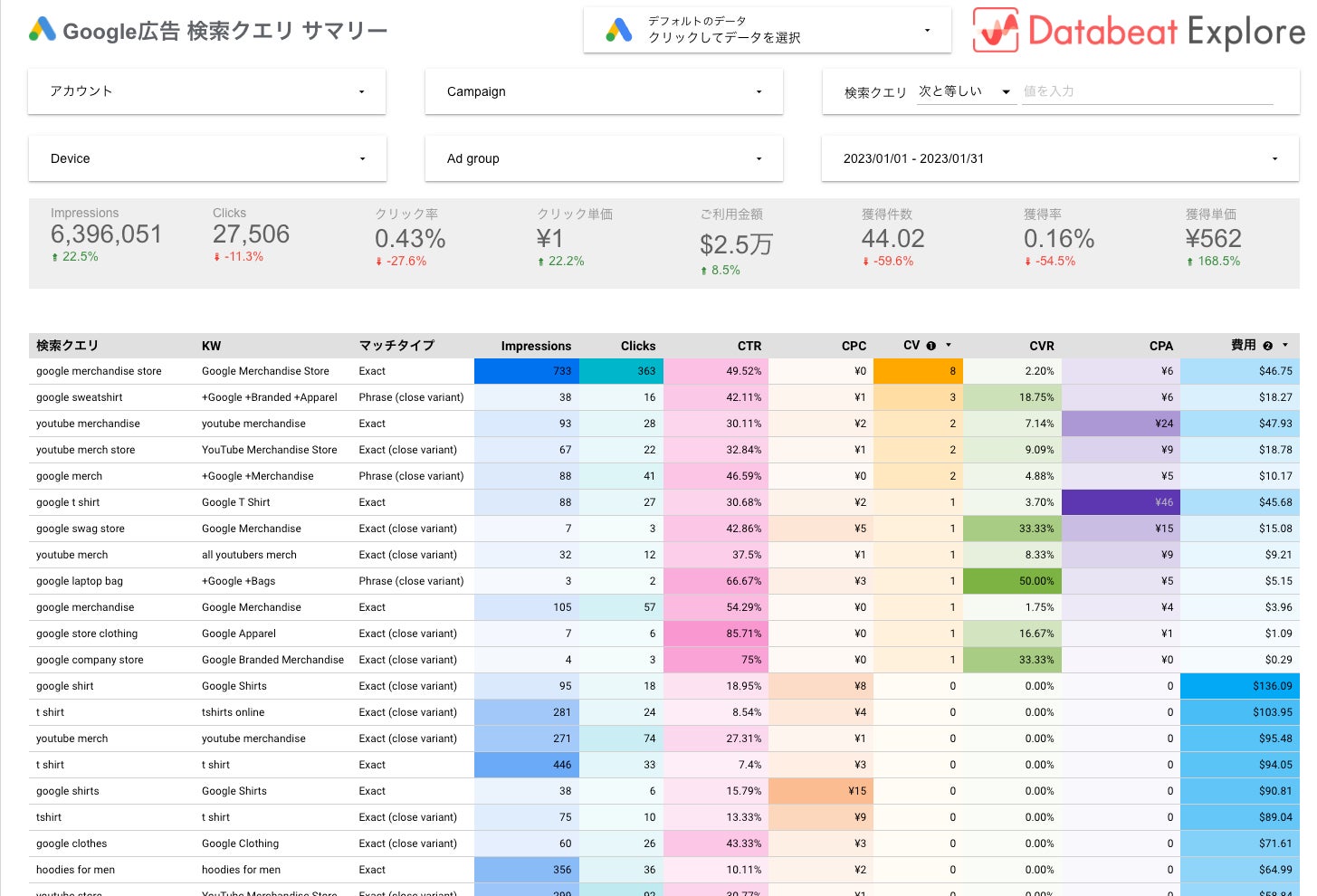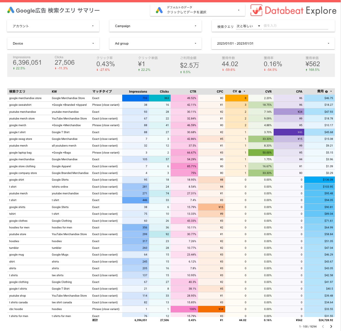 そして今回新たに作成した「Google広告版Looker Studio検索クエリパフォーマンス分析用テンプレート」では、検索クエリごとの詳細なパフォーマンスを簡単に把握することが可能です。