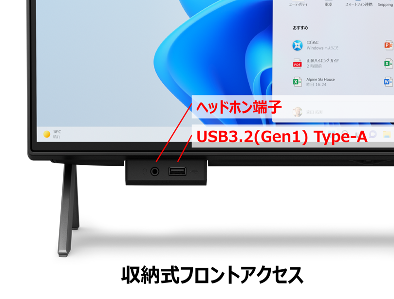 本体デザインを3年振りに一新。空間に溶け込むシンプル&省スペースと使いやすさの向上を実現しています。液晶画面の周囲の枠が狭い狭額縁画面とシンプルなスタンドを組み合わせたデザインコンセプトはそのままに、幅54.4cm×奥行18.9cmの省スペース設計を実現。新たに本体下部に収納式フロントアクセスを搭載することで、ヘッドホンやUSBメモリなどのよく使うデバイスを、パソコン正面の端子にすぐに接続できるようになりました。