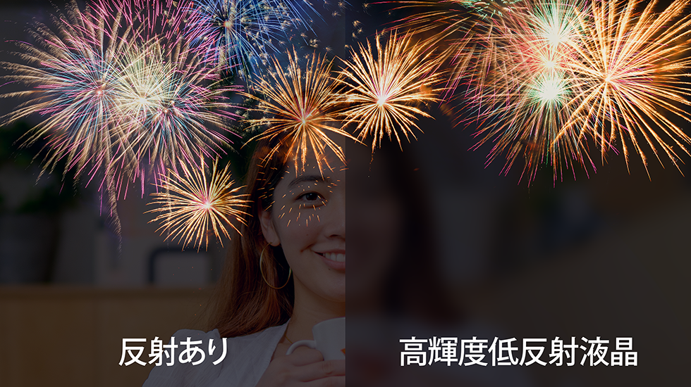 高輝度・高色純度のキレイな液晶画面に低反射処理を施しています。外光の映り込みを抑えつつ、美しい映像を楽しむことができます。