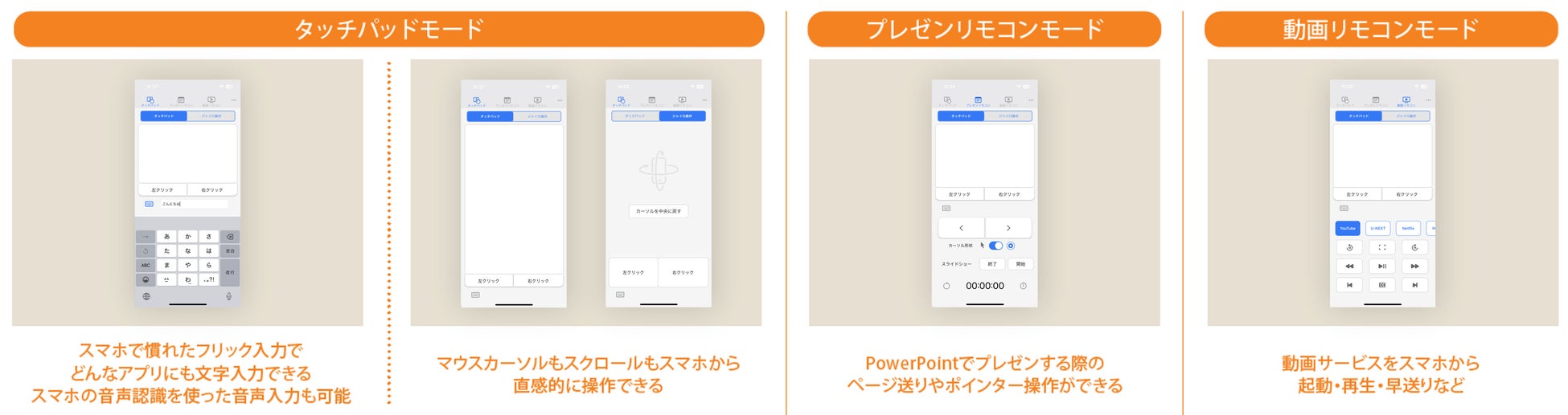 マウス操作やキーボード文字入力に自信が無くても、お手持ちのスマホからパソコンの操作ができるFMV独自のアプリです。スマホのフリック入力や音声入力を利用して、使い慣れた方法でパソコンへの長文入力を手軽に行えたり、パソコンのマウスポインターを操作できたりします。PowerPointのプレゼンテーション操作を可能にする「プレゼンリモコンモード」や、動画サイトや動画配信サービスの操作も手元でできる「動画リモコンモード」を搭載しています。