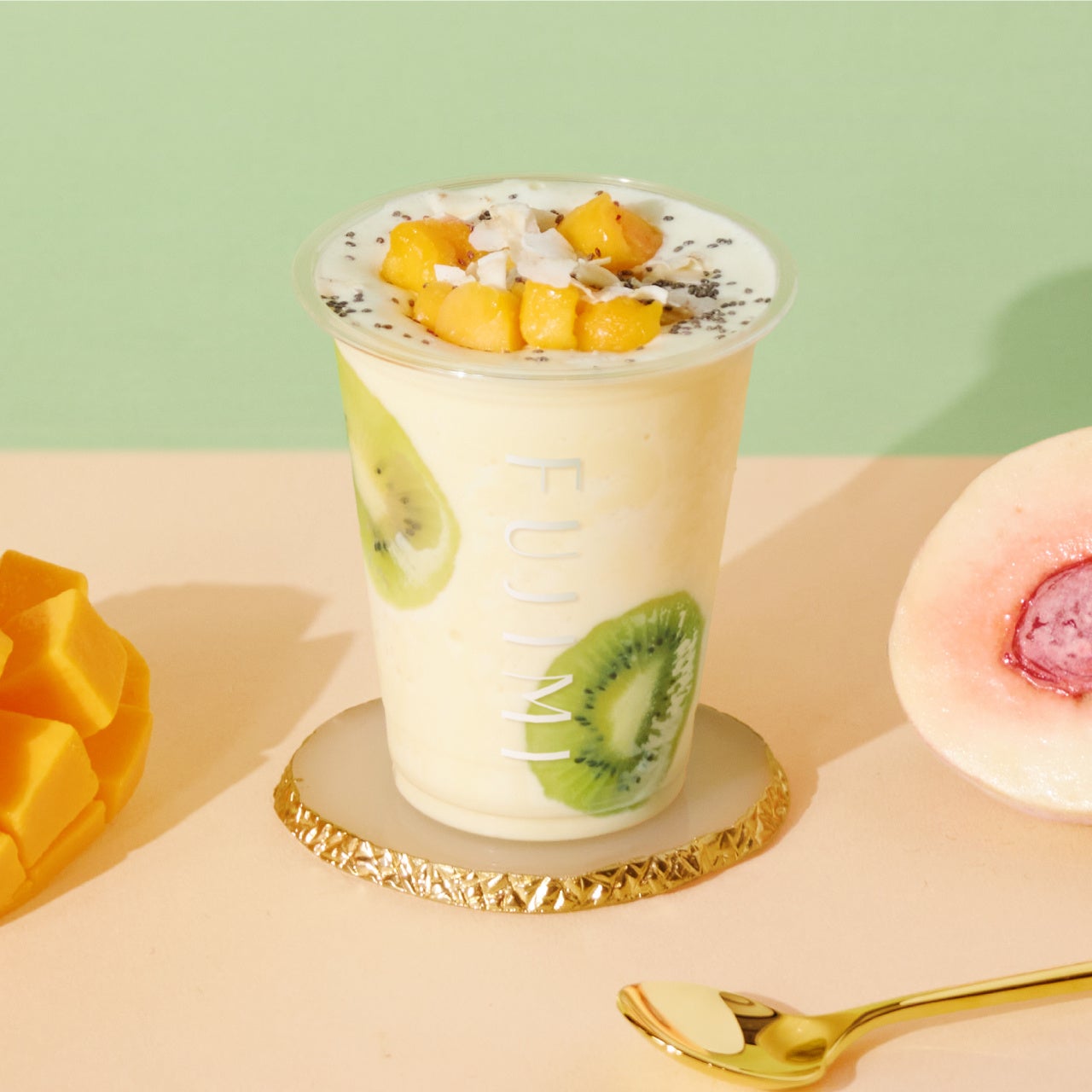 マンゴー、パッションフルーツ、ピーチなどのフルーツと無脂肪ヨーグルトのブレンド。