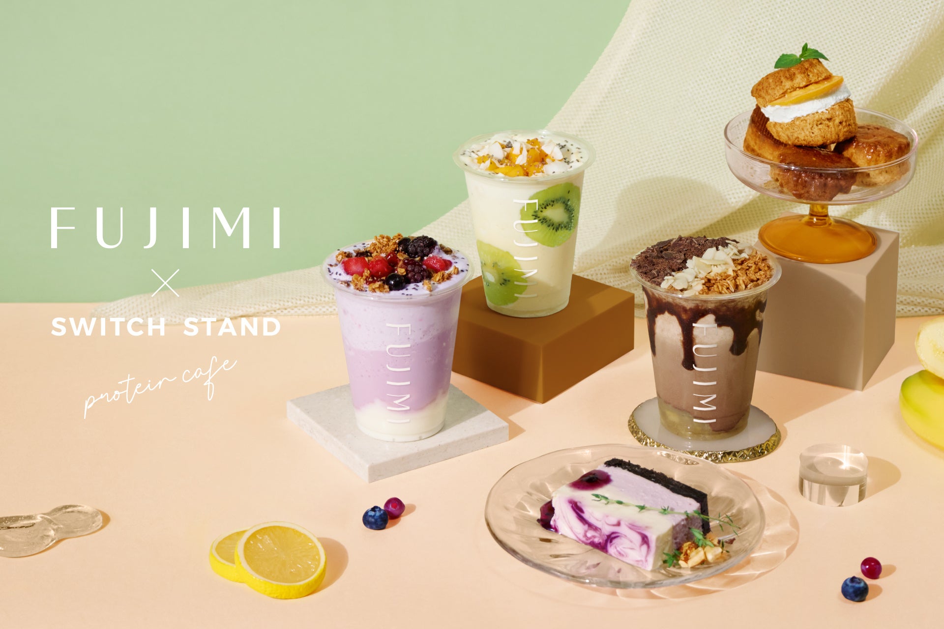 「FUJIMI×SWITCH STAND」では、「SWITCH STAND」の通常商品に加えて、共同でレシピ開発をした、FUJIMIプロテイン使用のオリジナル『プロテインスムージー』と『プロテインスイーツ』を販売いたします。