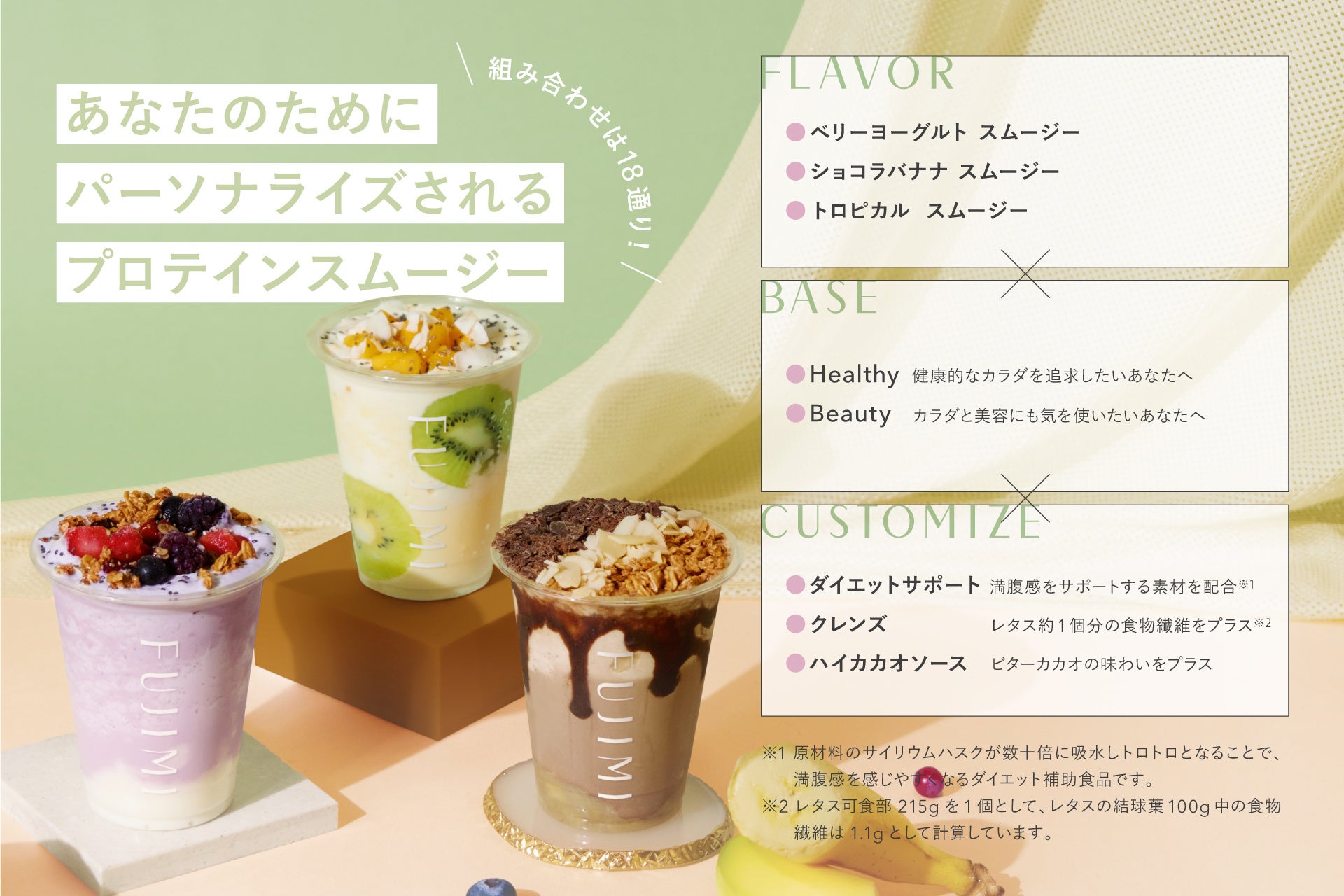 また、FUJIMIのパーソナライズ体験を店頭でも楽しんでいただけるよう、今の気分に合わせてパーソナライズされるプロテインスムージーもご用意。
