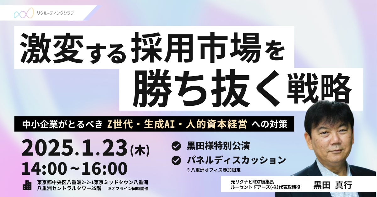 人事のための成長志向型コミュニティ「リクルーティングクラブ」を提供する株式会社HR Force(本社:東京都中央区、代表取締役社長:村田 泰子、以下HR Force)は2025年1月23日(木)、「激変する採用市場を勝ち抜く戦略」セミナーを開催することをお知らせします。