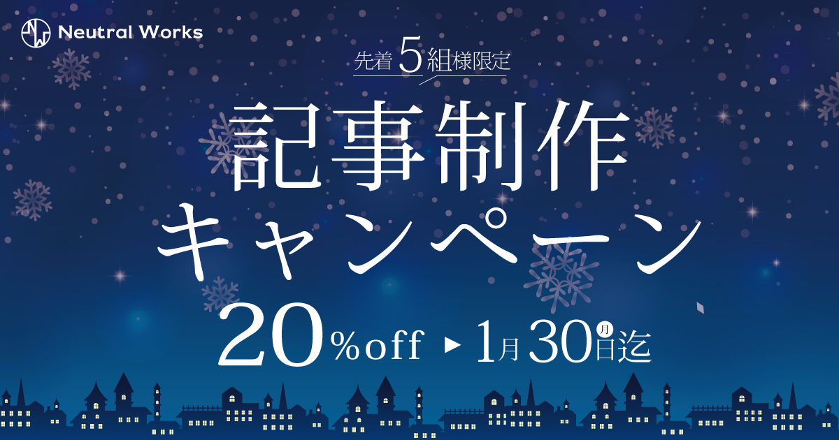 SEOに強みを持つニュートラルワークスが提供する「記事作成代行サービス( https://n-works.link/writing )」を、通常1記事50,000円(税別)のところ、期間限定で20%OFFの40,000円(税別)にてご利用いただけます。先着5組様までとなりますので、お早めにご応募ください。