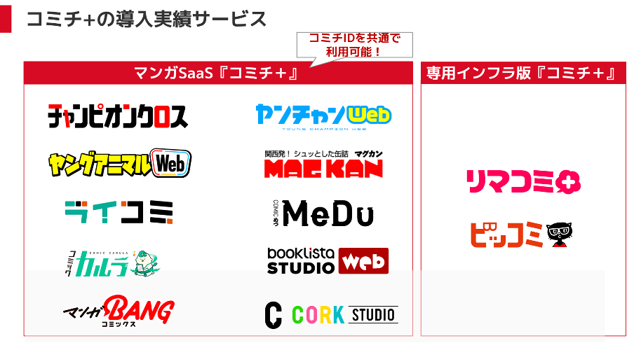 秋田書店「チャンピオンクロス」「ヤンチャンWeb」、白泉社「ヤングアニマルWeb」、小学館「ビッコミ」(専用インフラ版)など、出版社のWebマンガ誌のインフラを担っています。