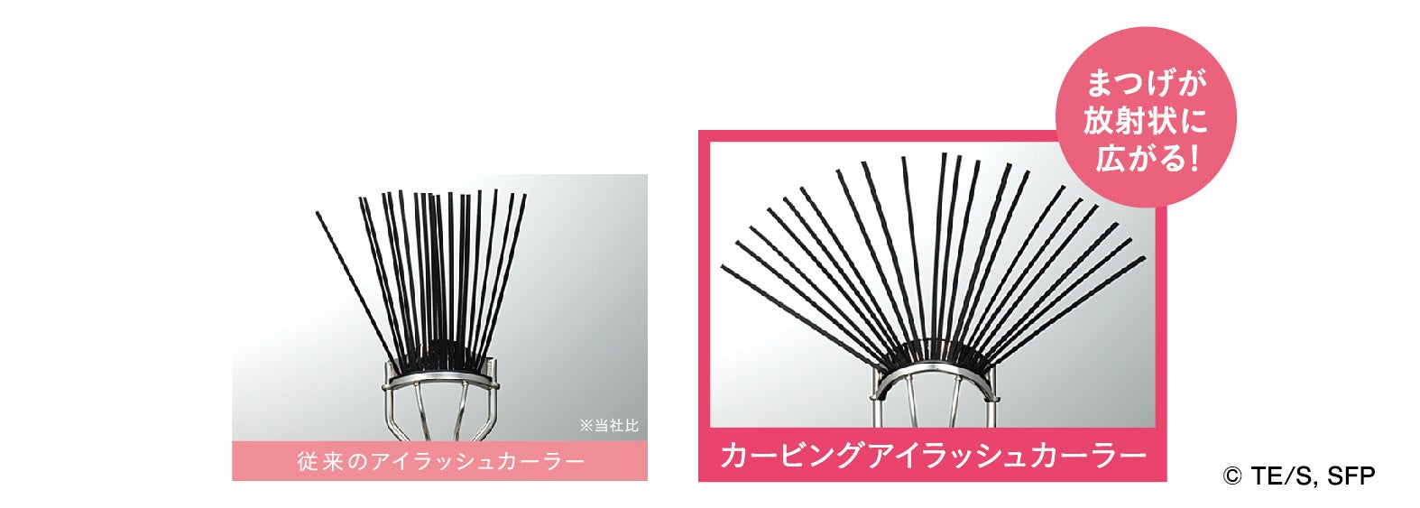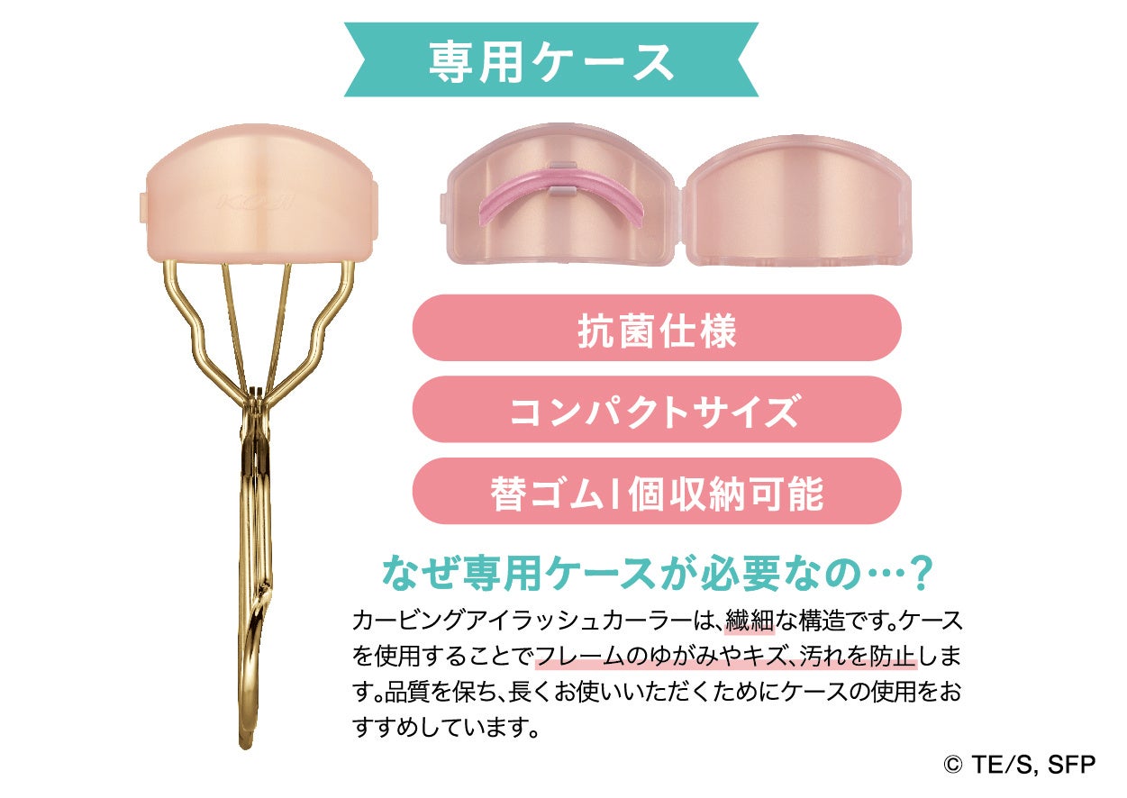 まつげを根本からキャッチし、放射状に広げるアイラッシュカーラー。目の丸み・目幅・目を開けたときのアイラインの3点にフィットする設計。20.5アール38mm幅。専用ケース付き(抗菌仕様)。替ゴム付き(2個)。