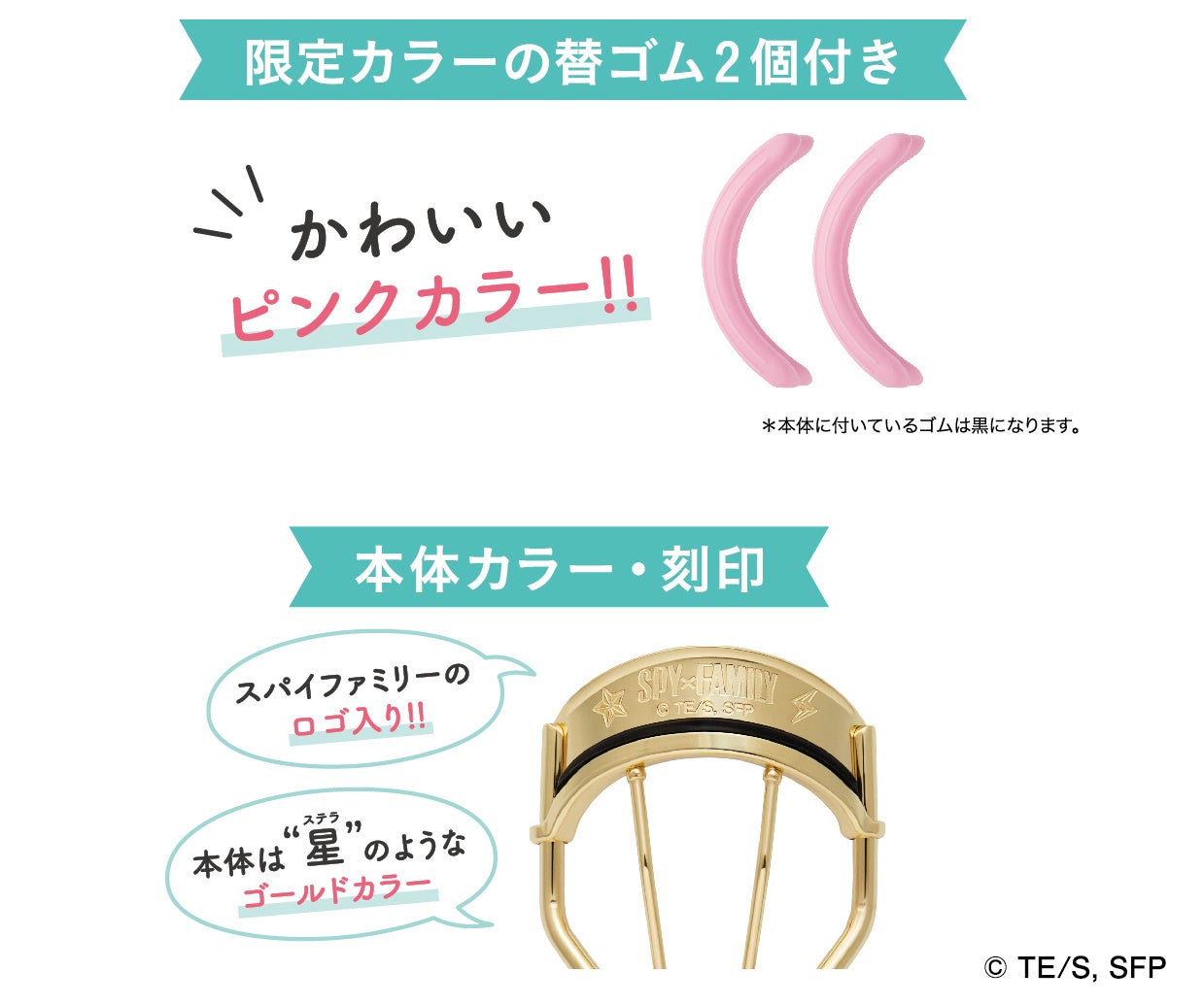 パッケージはかわいいアーニャとボンドに、アーニャの好物のピーナッツが描かれた限定デザイン。アイラッシュカーラー本体は“星”(ステラ)をイメージしたゴールドカラーに、「SPY×FAMILY」のロゴが刻印されています。限定カラーのパステルピンクの替えゴムも付いたプレミアム仕様です。
