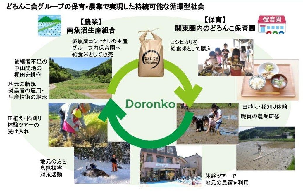 保育活動の一環として米の生産・収穫の労働を知るために、創業当時の1998年から南魚沼市で田植え・稲刈り体験ツアーを実施してきました。その中で棚田の後継者不足の問題を聞き、2013年、南魚沼の農業を守るために地元農家の方と共同で「株式会社南魚沼生産組合」を設立。減農薬の給食米生産による栽培技術伝承、棚田の放棄地対策、地域雇用創出等を実現し、保育×農業で南魚沼の持続可能な循環型社会づくりに取り組んでまいりました。