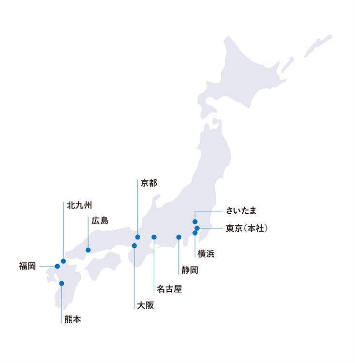 拠点 東京、さいたま、横浜、静岡、名古屋、大阪、京都、広島、福岡、北九州、熊本
