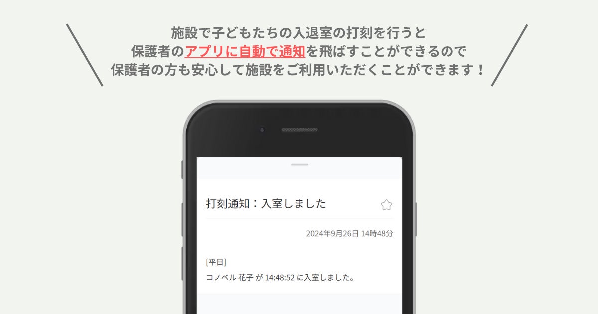 子どもたちが施設で入退室打刻を行うと、保護者のスマホアプリに自動で施設への「入室と退室を知らせる通知」をお届けすることが可能です!