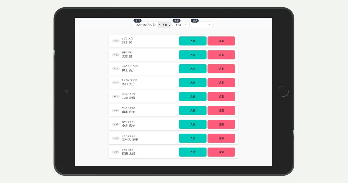 従来手書きで管理をしていた子どもたちの施設への入退室管理は、タブレットでカンタンにタッチ操作をするだけで記録が可能!