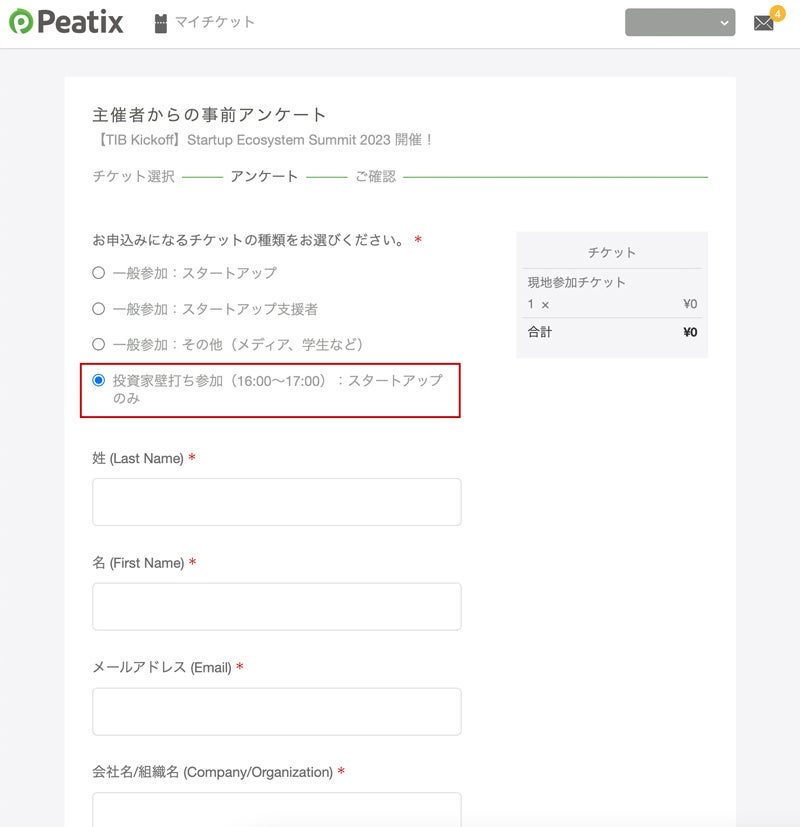 ③申込みフォームの「チケットの種類」で「投資家壁打ち参加(スタートアップのみ)」を選択し、お申し込みください。