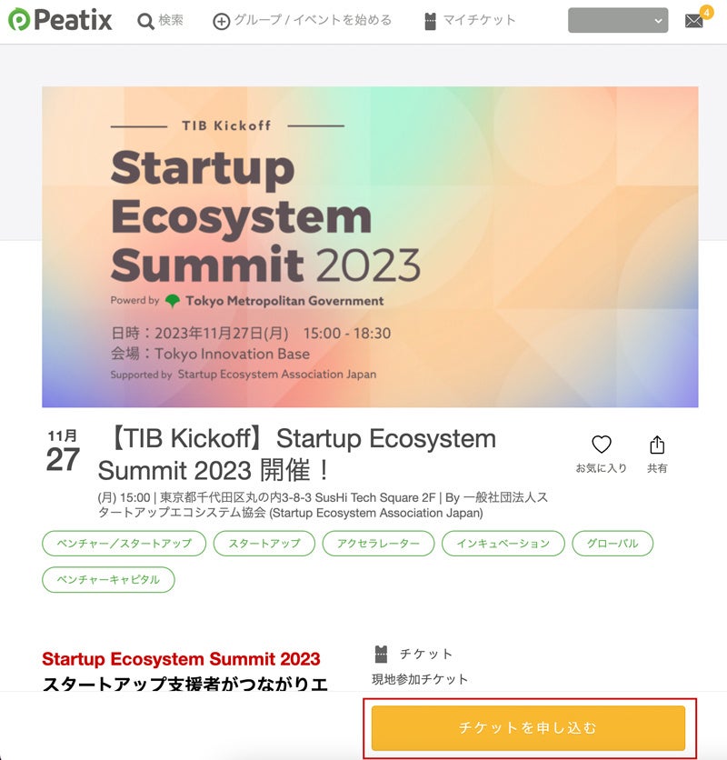 ①Startup Ecosystem Summit 2023 申込ページ(https://ses2023.peatix.com/)から「チケットを申し込む」をクリックしてください。