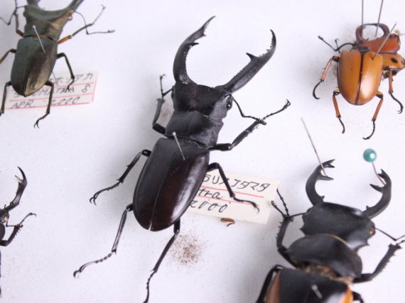 カブトムシ・クワガタムシを中心に 10~15種の標本を展示。(レンタル提供)