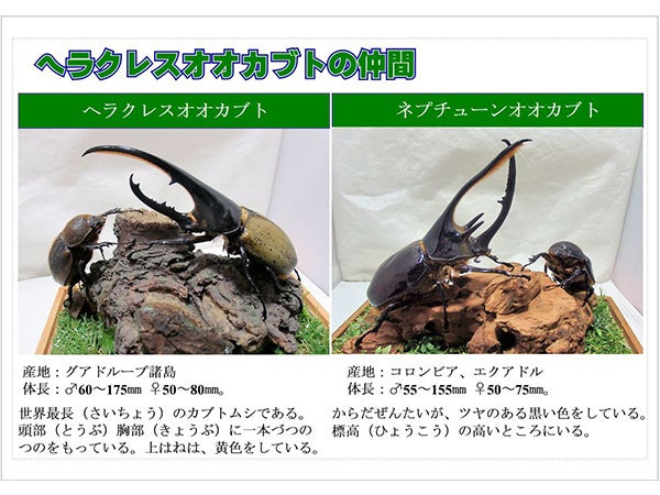 小学館の図鑑NEO編集部監修の「ヘラクレスオオカブト」「コーカサスオオカブト」の説明パネル。