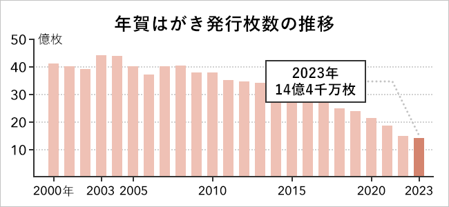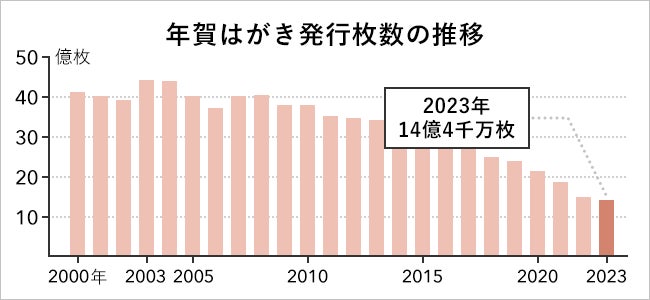 日本郵便によると2024年用年賀はがきの当初発行枚数は前年比12%減の約14億4千万枚。2003年をピークに年々減少しており、着実に市場は縮小しています。近年多くの人が年賀状じまいする一方で、コロナ禍をきっかけに年賀状や紙文化の良さに気付く人や、日本の伝統文化として続けているという年賀状推進派もまだまだ多く、年賀状論争はもはや年末の風物詩にもなっている昨今です。