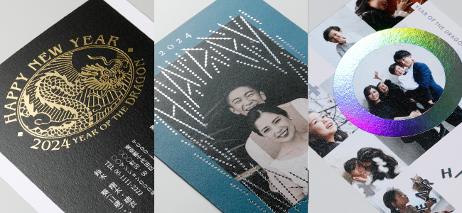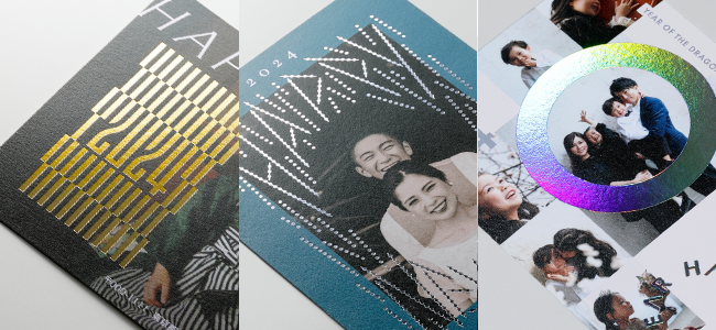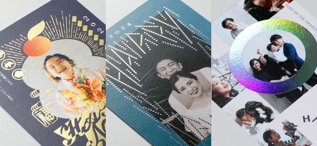 年賀家族の「HAKU」シリーズは、ハレの写真が映える豪華な箔押し年賀状。インターネット受注の年賀状によくある箔押し印刷ではなく、職人が一枚一枚手で箔押し加工を施します。目視で写真の位置を微調整して箔押しをするので、写真の顔部分が箔で隠れてしまうということはありません。手間やコストがかかっても、大切な一枚のために妥協しない「年賀家族」を象徴するような商品です。王道の〈金箔〉、光の当たり方によって色の見え方が変化する〈ホログラム箔〉の2種類に加え、今年は〈銀箔〉が新登場。控えめながらも洗練された美しい輝きを放つ銀箔は、ウェディングフォトやニューボーンフォトなどと相性が良いので、結婚報告や出産報告を兼ねた特別な年賀状におすすめです。