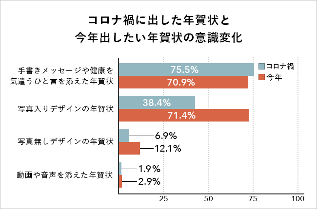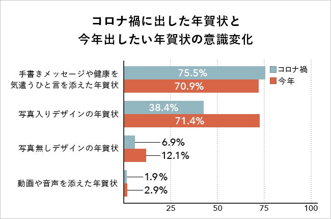 「年賀家族」が今年独自に行なった調査(※1)では、6割以上の人がこれからの年賀状は「儀礼ではなく本当に大切な人に送り続けたい」と考えているという結果が出ました。SNS等で繋がっていない人や遠方に住む人に連絡をとるきっかけとして大事にしたいと考える人や、大切な人には手間をかけてでも紙の形で届けたい人が多いことがわかりました。また、今年の年賀状について7割以上の人が「写真入りの年賀状を出したい」と回答。年賀状に使える写真が無く、写真無しの年賀状を送る人が多かったコロナ禍に比べ、今年は写真入りの年賀状を出す人が増えることが予想されます。