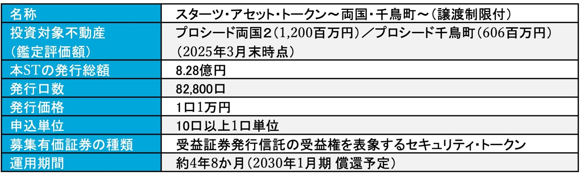 ご注意: 本リリースは、スターツ・アセット・トークン~両国・千鳥町~(譲渡制限付)の公募及び発行についての協働に関して、一般に公表するための文書であり、国内外を問わず個別の金融商品等への投資勧誘を目的として作成されたものではございません。投資を行う際は、必ず発行者が作成する受益権発行届出目論見書及びその訂正事項分をご覧いただいたうえで、投資家様ご自身の責任と判断でなさるようお願いいたします。