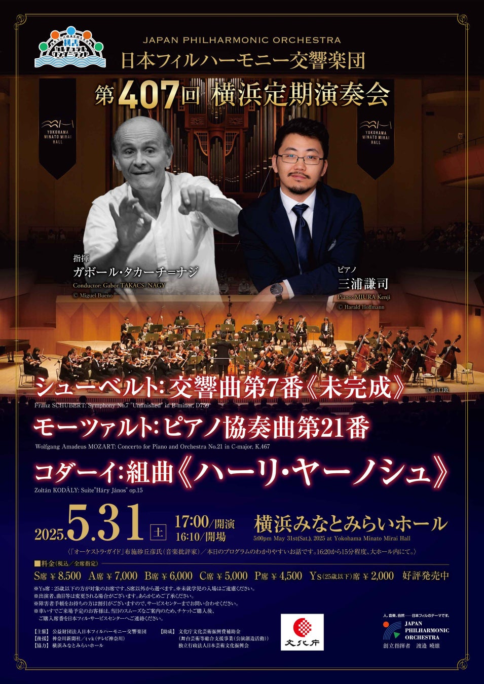 公益財団法人日本フィルハーモニー交響楽団(東京都杉並区、理事長:平井俊邦)は、2025年5月31日(土)に第407回横浜定期演奏会(横浜みなとみらいホール、17時開演)を開催します。ハンガリーの名匠であり名ヴァイオリニストとしてもその名を馳せるガボール・タカーチ=ナジが初めて日本フィルの指揮台に登場。ハンガリーの民俗楽器であるツィンバロンが活躍する「お国もの」コダーイの名作《ハーリ・ヤーノシュ》をメインに据え、クラシック作品の王道でもあるシューベルト《未完成》とモーツァルトのピアノ協奏曲第21番を取り上げます。オーケストラの名曲を楽しみたい方、吹奏楽で《ハーリ・ヤーノシュ》に親しんだことがある方、ハンガリーの文化や音楽を愛する方に特におすすめの公演です。