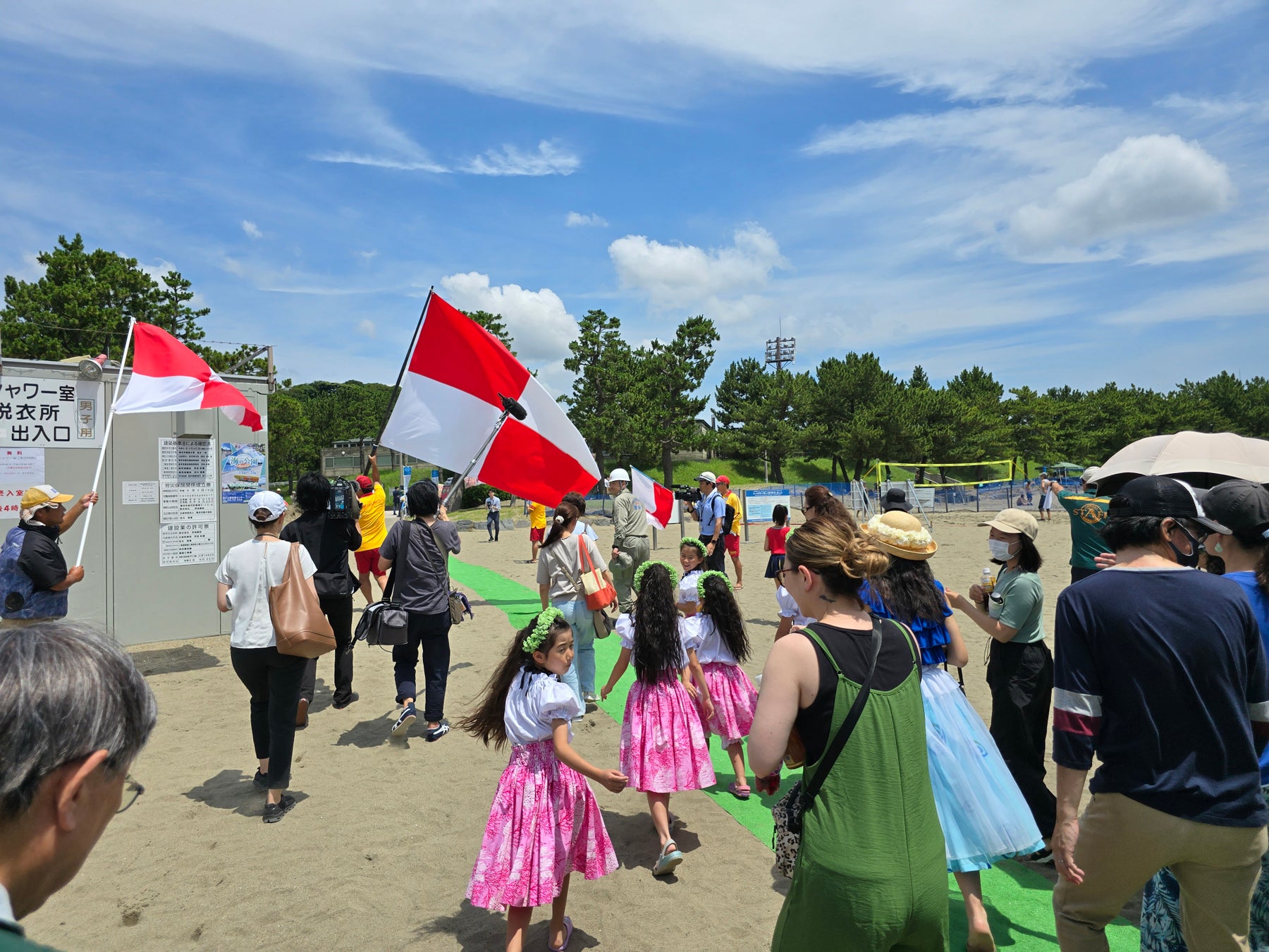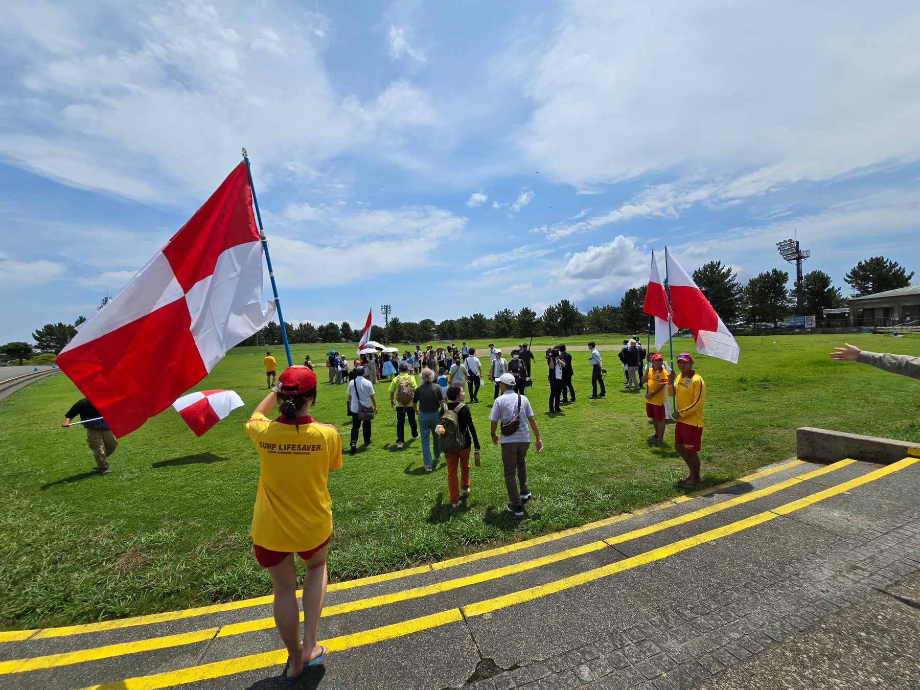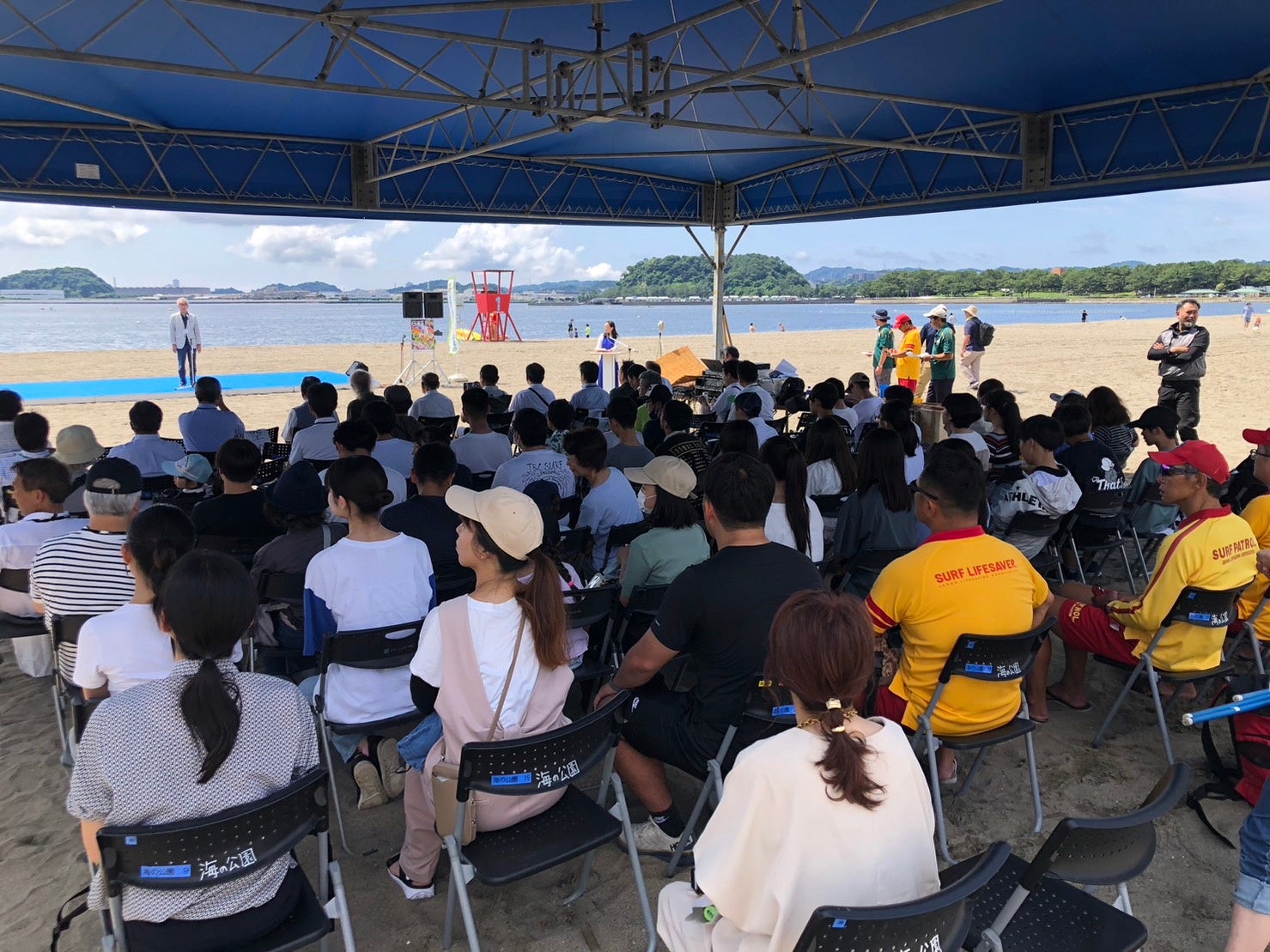 津波フラッグのさらなる認知度向上をめざして、2024年7月13日(土)に神奈川県横浜市の海の公園海水浴場での海開き式典において、津波避難訓練が実施され、「津波フラッグ」の利用方法と重要性が参加者に周知されました。