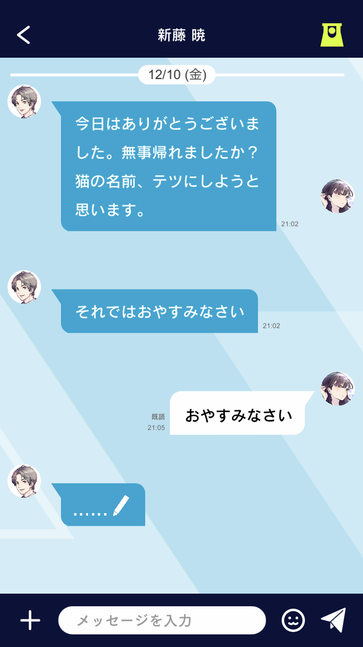 束縛彼氏は、彼氏とチャットをしながら関係性を深めて物語を進めていきます。このチャットパートは『束縛AI対話システム』を起用し、キャラクターごとに一貫した人格で自由対話※を実現しています。