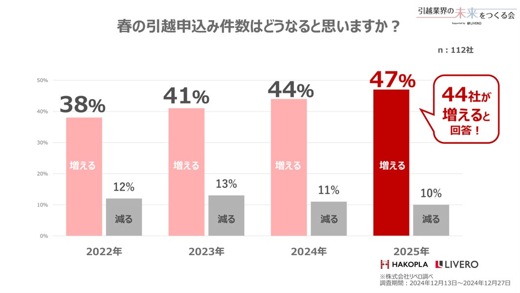 調査結果によると、昨年よりも増えると回答した引越会社が47%に上り、これはここ4年で最大の割合となっています。対応可能件数が減った引越会社が多い一方で、引越申込み件数の増加傾向は年々強まっていることが分かりました。