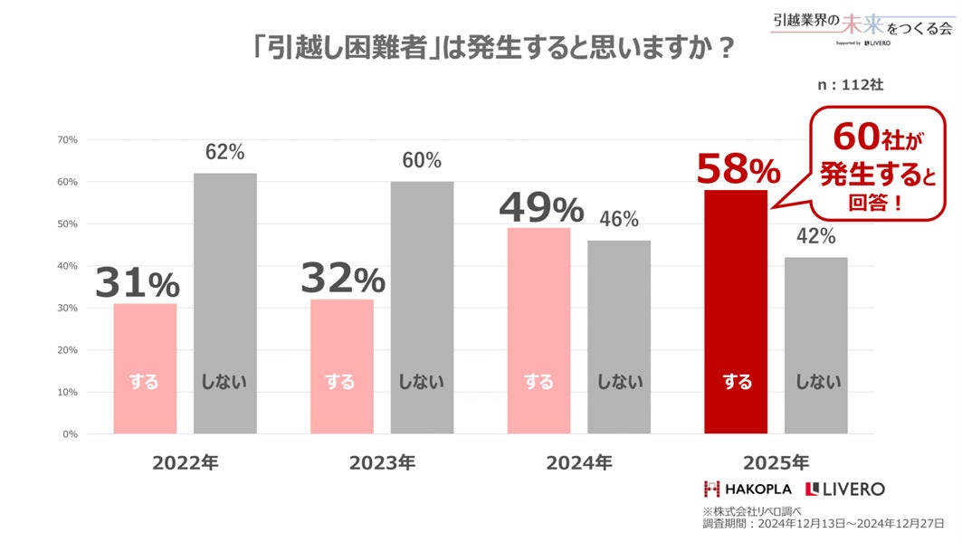 発生すると回答した引越会社は58%に上りました。需要が拡大する一方で、「2024年問題」の影響が継続しており、今年も引越し困難者が発生すると予測する引越会社が過半数を占めています。また、「長距離案件から撤退する」「長距離引越を希望するお客様をお断りする案件が多数あった」といった声もあり、特に長距離便における引越し困難者の発生が懸念されています。
