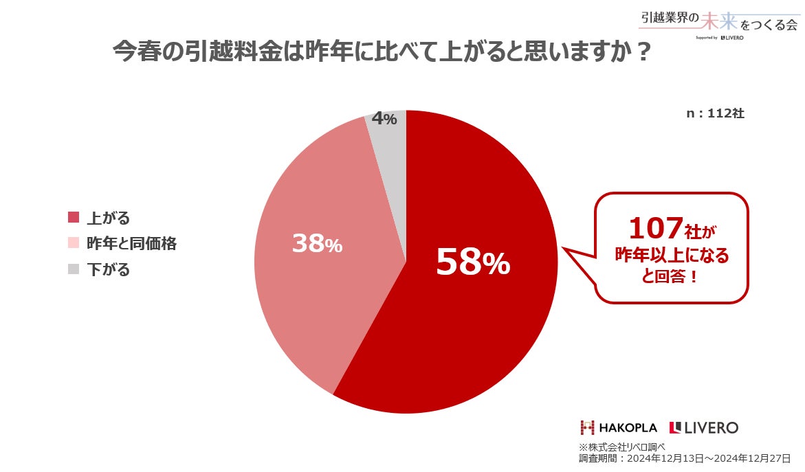 昨年より引越料金が上がると回答した引越会社は全体の58%でした。その主な理由は前述の「2024年問題」によるものです。さらに物価高による燃料や資材の価格高騰や、人件費の上昇も引越料金の値上がり要因として多くの引越会社が挙げています。さらに38%の引越会社が「昨年の価格と同じである」と回答しており、全体の96%の引越会社が2024年問題の影響は継続、もしくは悪化していると考えていることが分かりました。