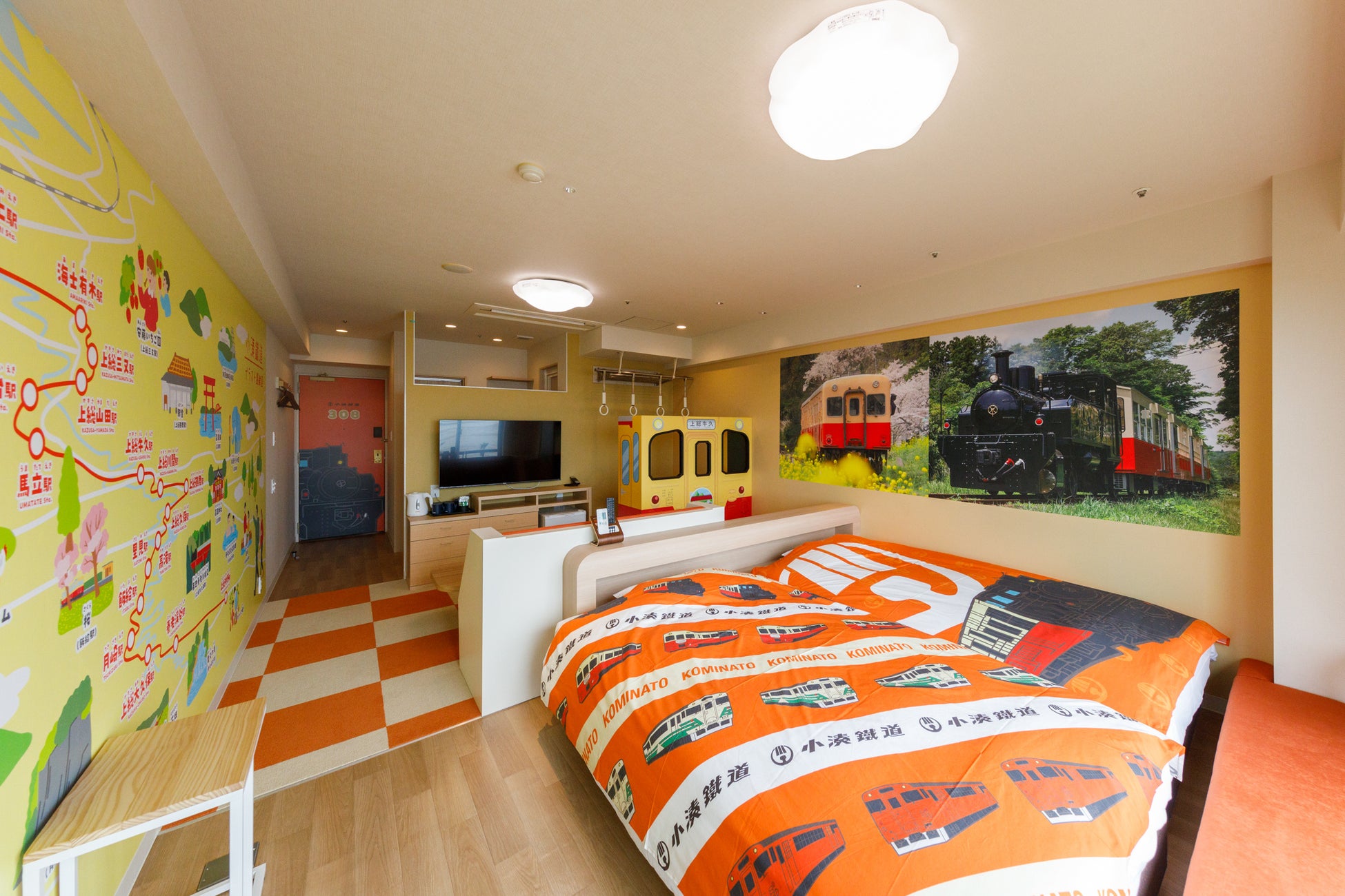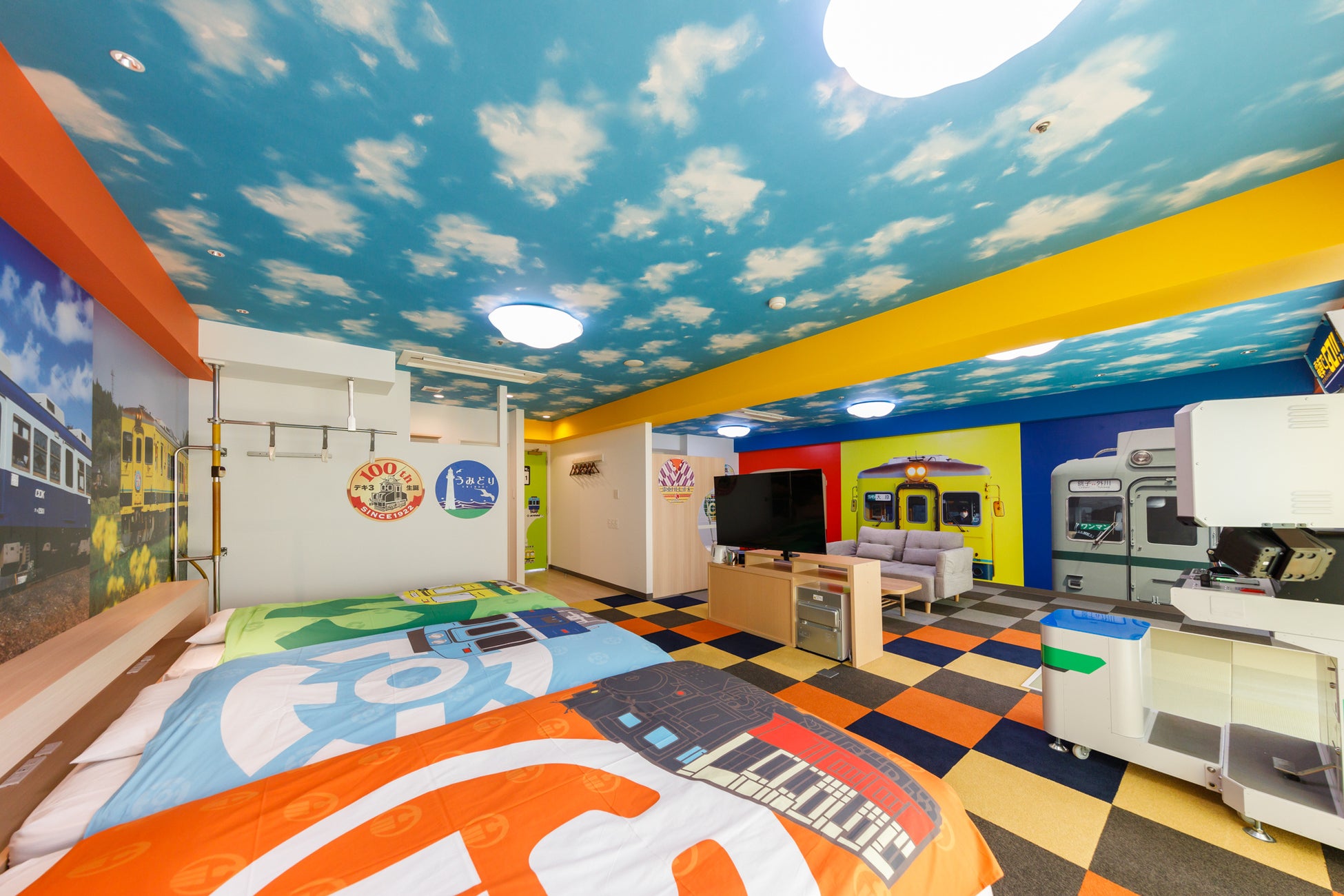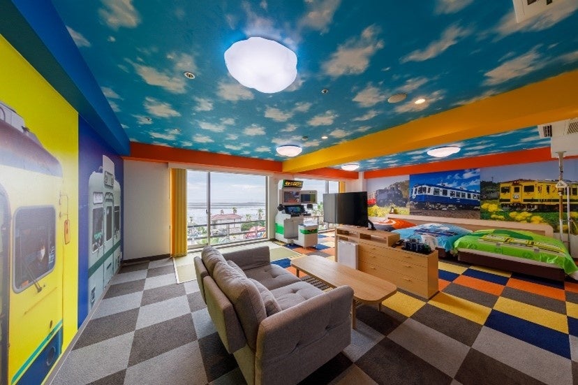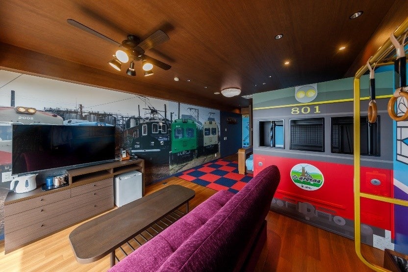 「小湊鉄道」「いすみ鉄道」「銚子電気鉄道」の3つの鉄道会社の特徴を集めたオリジナル鉄道ルームになります。 3社各社の車両フェイスが並んだ豪華な仕立てに加え、『電車でGO』ブースを設置し楽しく過ごしていただける設定です。2部屋を1部屋に拡大しており、ベッド3台と寝台列車風2段ベッドも設置して8名までご利用いただけます。