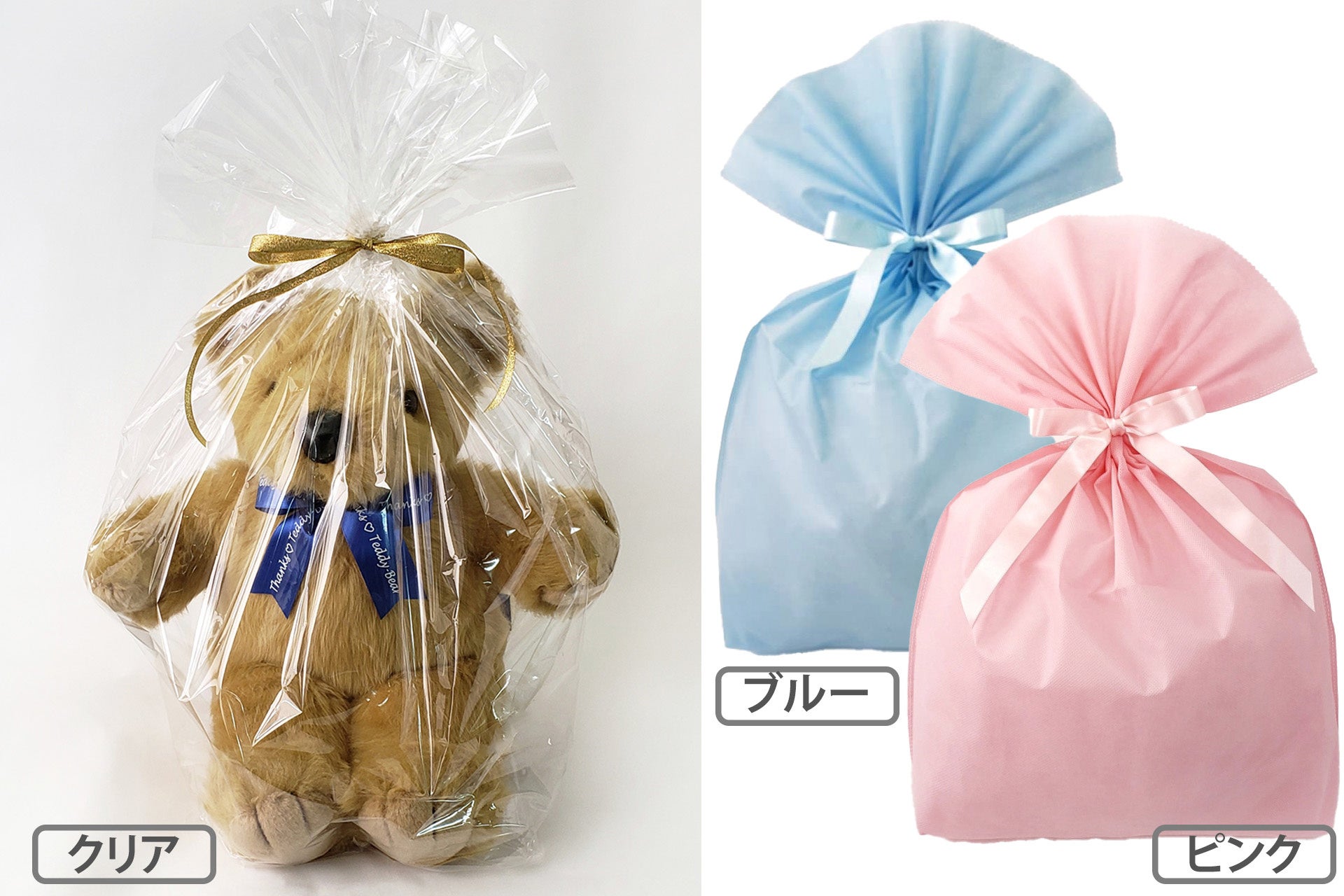クリアラッピングはくまさん工房からのお祝いとして無料でお付けします。ベアの顔が見え、晴れ着にウェイトベアの毛がつくことを防げくことができます。ピンク・ブルーのラッピングもご用意。ご希望、ご利用シーンに合わせてお選び下さい。