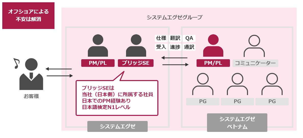またオフショア先であるシステムエグゼベトナムのPM/PLは、日本への出張機会もあり日本のPM手法や文化を学んでいるため、文化や言語による齟齬が生じにくくなっています。