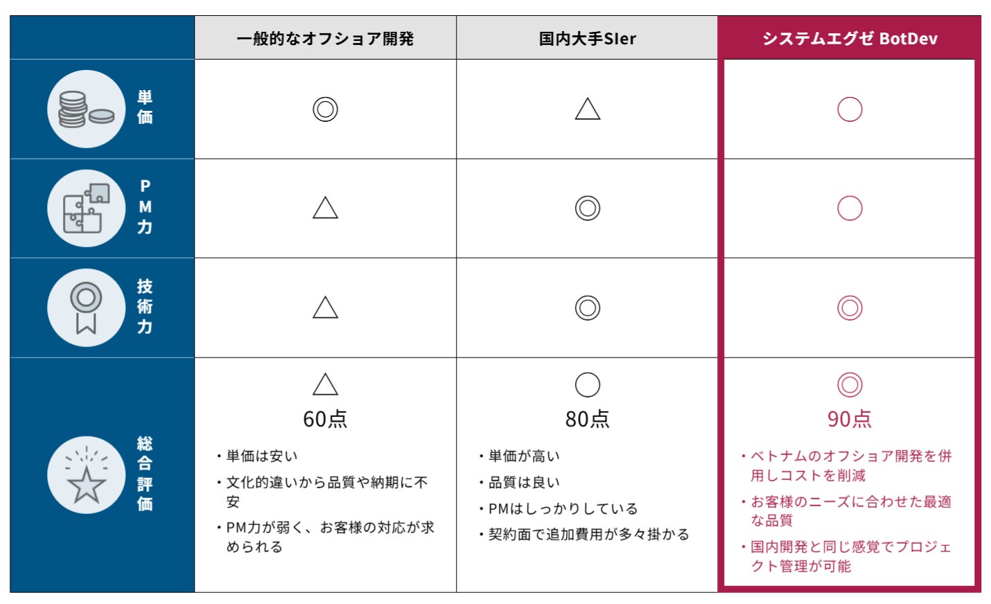そこで当社はこれらの課題を解決するために、現地法人であるシステムエグゼベトナムを含むグループ一体で手厚い体制を構築し、プロジェクト品質の不安を払拭。品質とコストの“いいとこどり”ができるシステム開発サービスを「BotDev」(Borderless OneTeam Developmentの略)として改めてリリースするに至りました。