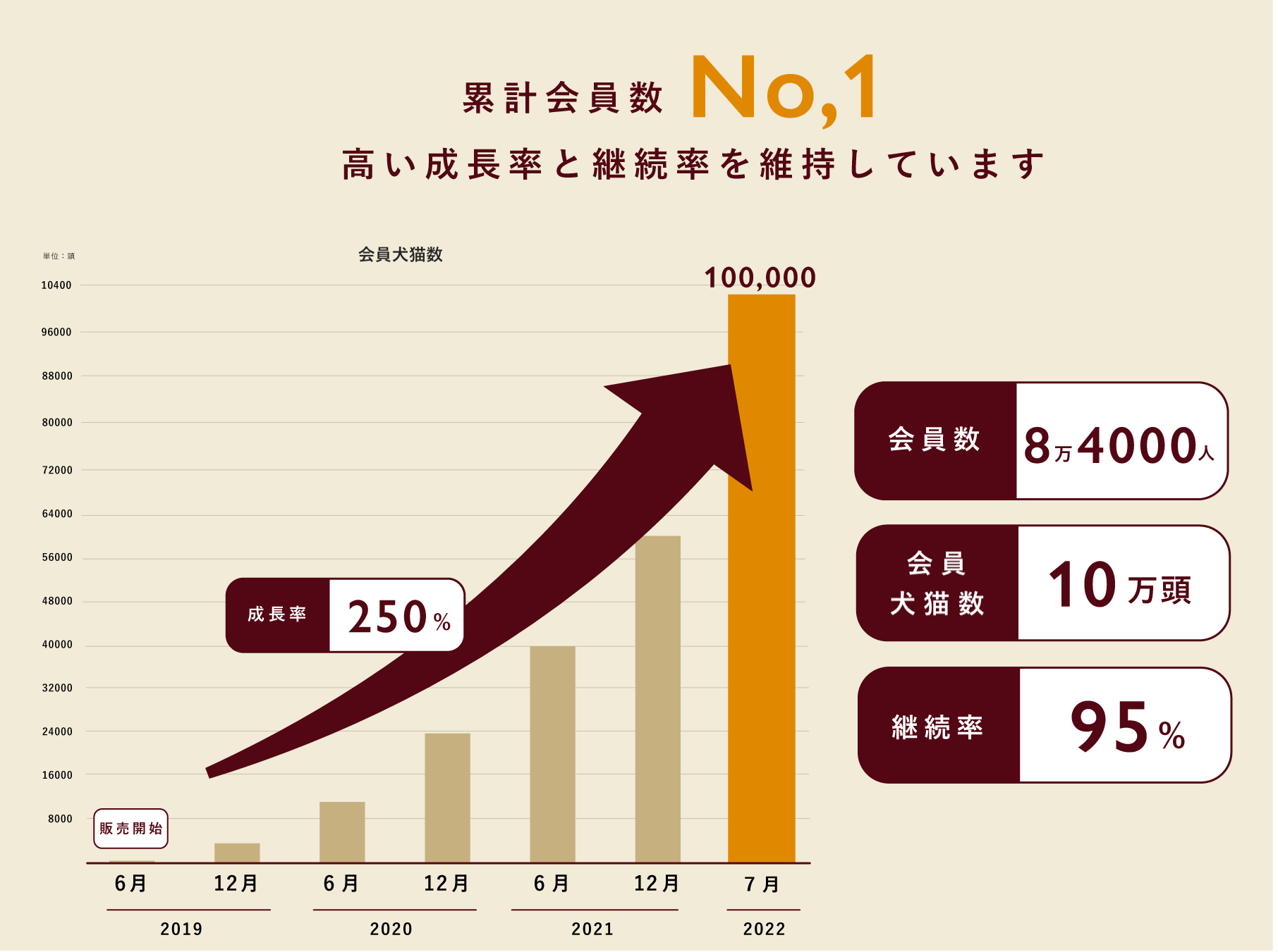 D2C(ダイレクト・トゥ・コンシューマー)ならではビジネスモデルで、飼い主様のお声を商品開発に生かし、これまで7度の商品改良を重ねてきました。常に飼い主様の視点に立ったものづくりで多くの愛犬家のご支持をいただき、会員数No.1、継続率95%を実現しています。