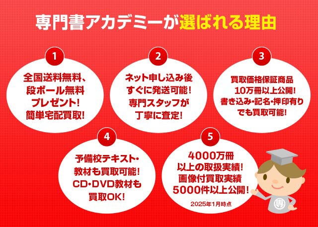 買取では、「学参プラザ(受験参考書・問題集・赤本・予備校テキスト・教材の専門買取店)」「専門書アカデミー(専門書・医学書・大学教科書・資格試験参考書・問題集・予備校テキスト・教材の専門買取店)」「メディカルマイスター(医学書・医療系書籍・予備校テキスト・教材の専門買取店)」の3サイトを展開しています。インターネットから申し込みをして宅配便の着払いで送るだけの簡単買取。全国から送料無料で買取可能。ご希望の方には段ボール無料送付サービスも行っています。