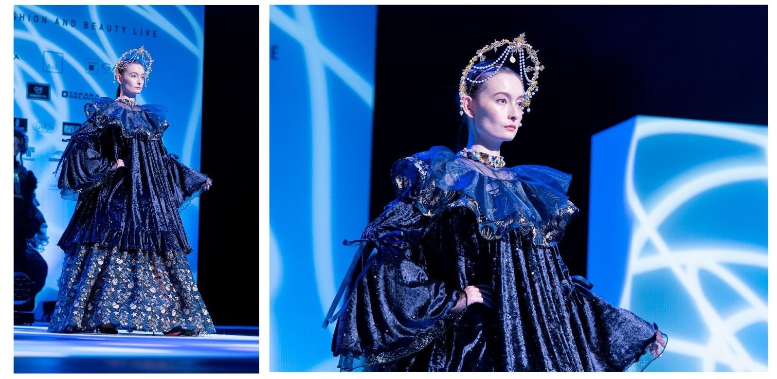 1次審査の時から素晴らしい作品がたくさんあったので、まさか私がグランプリを獲れるなんてとてもびっくりしました。嬉しいですし、頑張って良かったなと思います。将来はパタンナーを目指して頑張りたいです。 作品は美しい夜空をイメージしました。漆黒の夜空のような生地や、星柄の生地などを使用しており大胆なフリルが特徴的です。