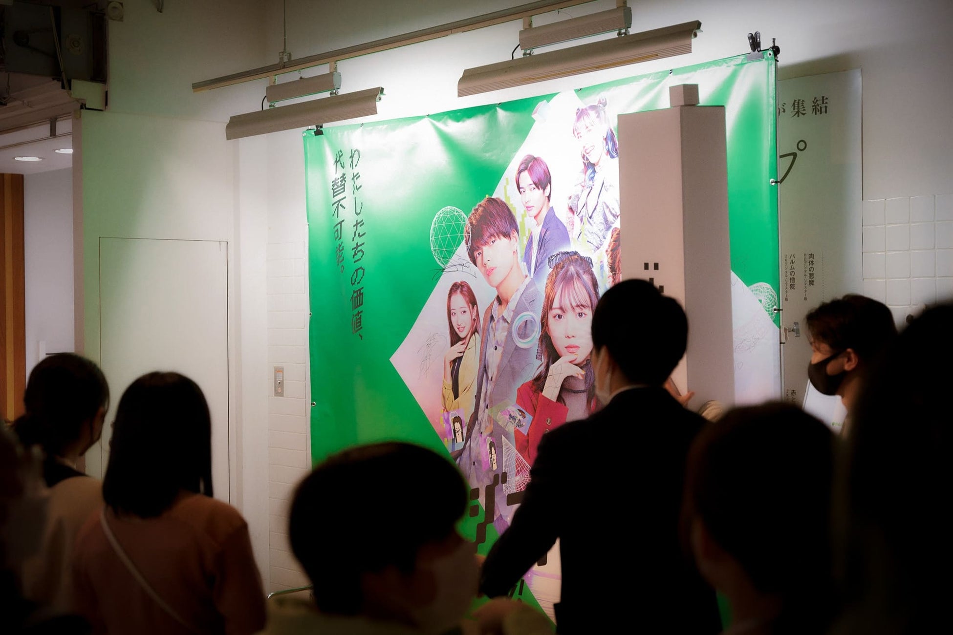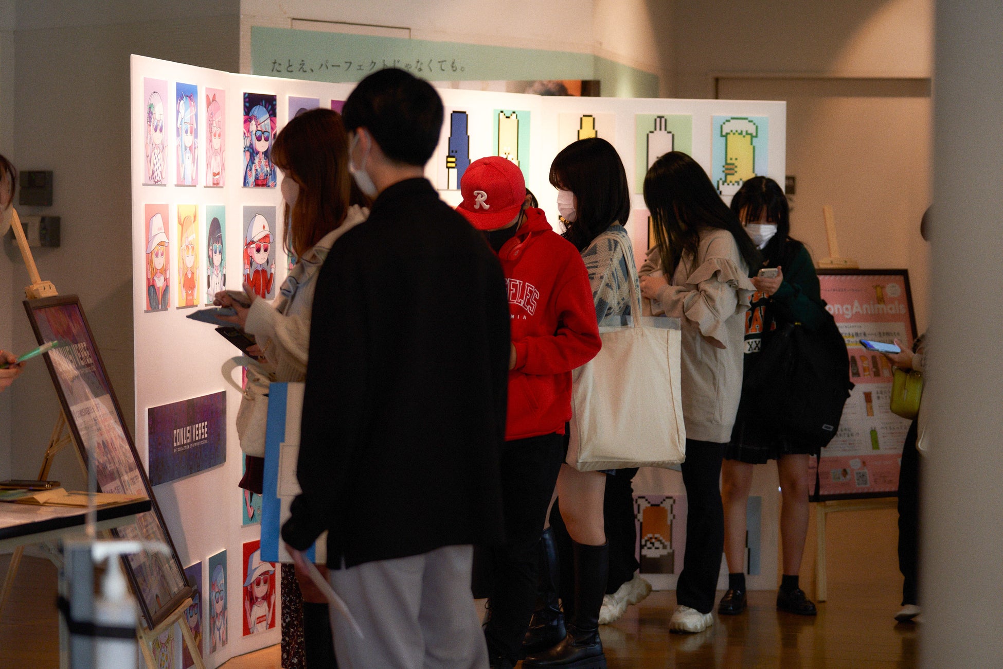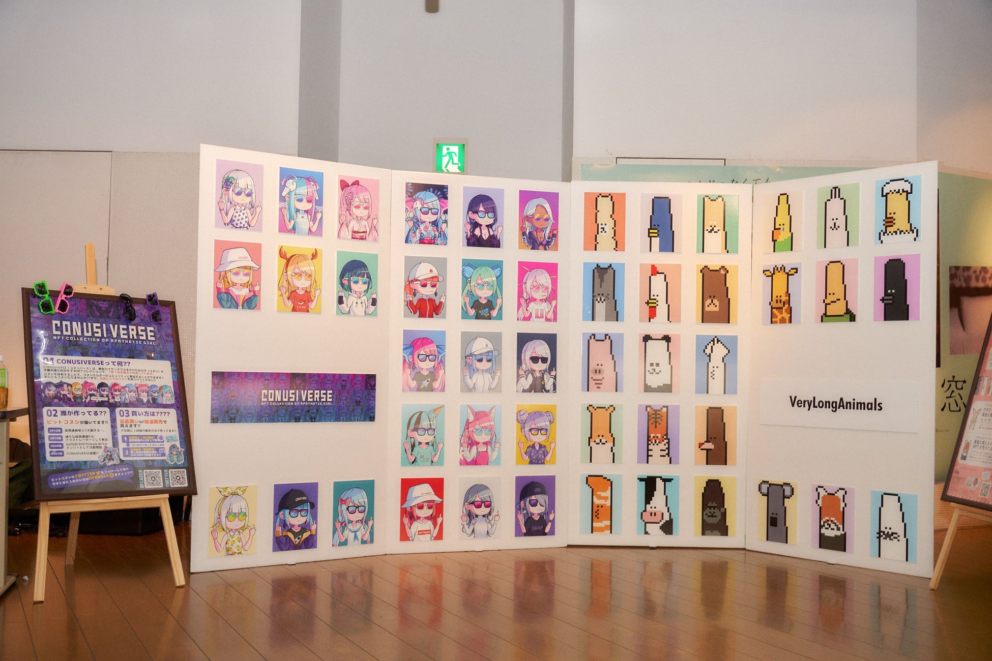 劇場外の待合スペースでは、キャストサイン入りの巨大なドラマメインビジュアルとドラマに協力いただいたNFTプロジェクトである「CONUSIVERSE」と「VeryLongAnimals」のNFTコレクションが華やかに並ぶフォトスポットが設けられました。さらに、102ものNFTプロジェクトと企業が参加するNFTサポーターズのポスターも展示。初めてNFTを見る方もNFTと同じポーズで撮影したり、VeryLongAnimalsになれる被り物をかぶって和気あいあいと写真を撮りながら、多くの方がNFTの楽しさを感じられる特別なイベントになりました。