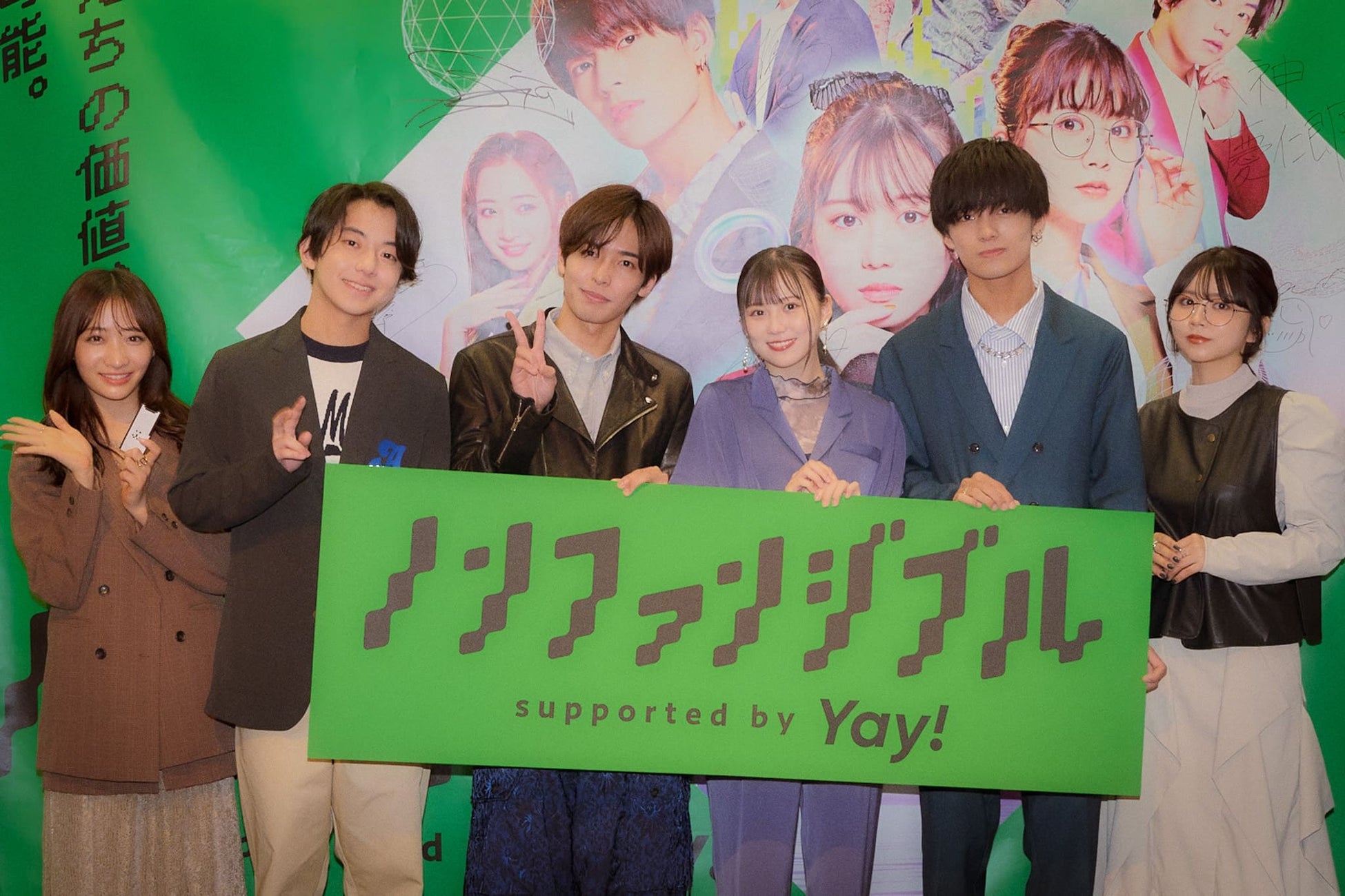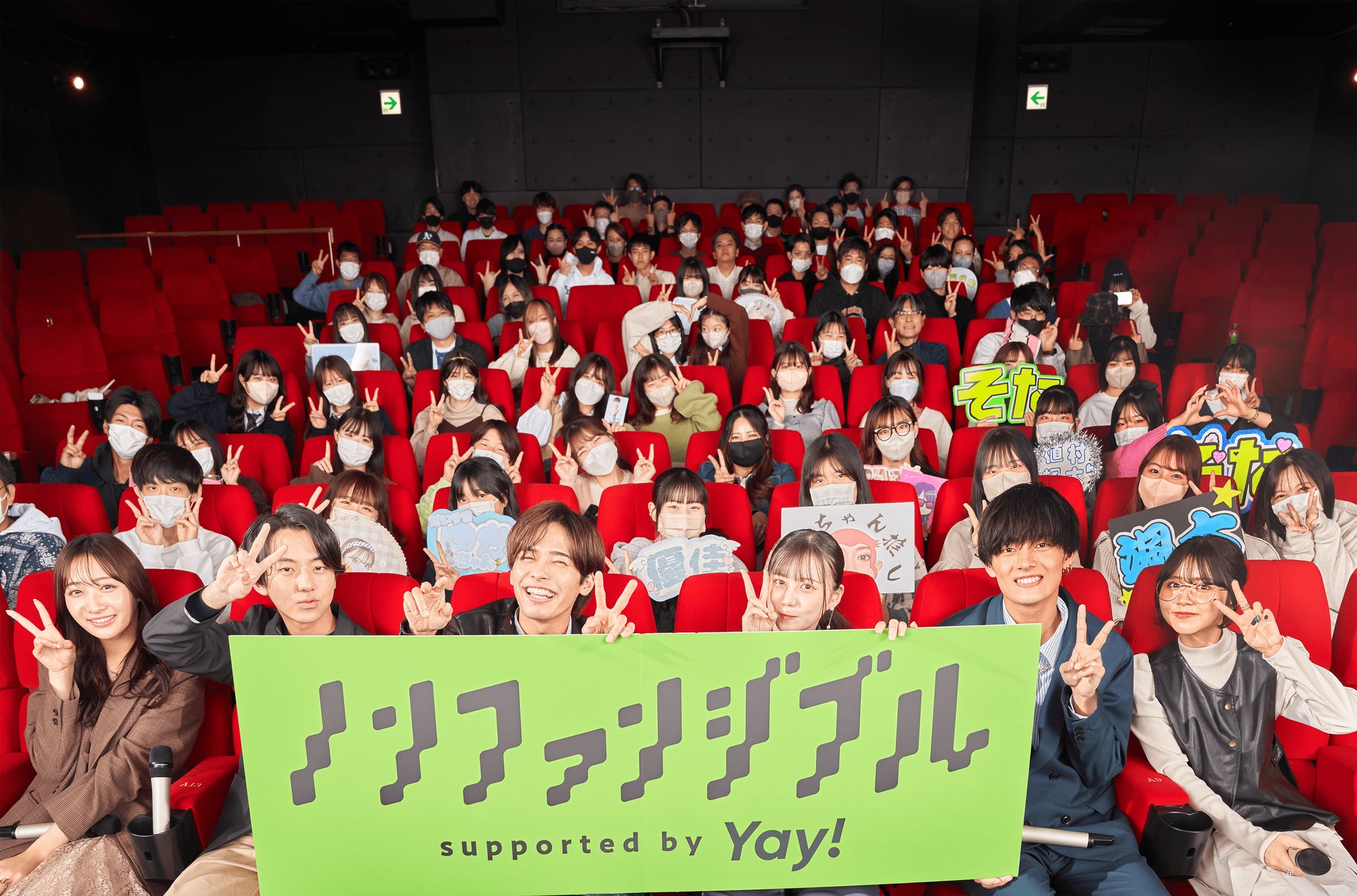 イベントには、SNSドラマ『ノンファンジブル』supported by Yay!の出演者、兼本弥生役 三原羽衣、秋葉まさのり役 植村颯太、花森茜役 高梨優佳、たつる役 相馬理、なみお役 八神慶仁郎、はるか役 石川翔鈴、原案・監督を務めた田村啓介の7名が登場。司会は、お笑いコンビのヴェートーベン久保隆司さんと青井 貴治さんが務め、上映会には、増席の上抽選にて160名をご招待しました。