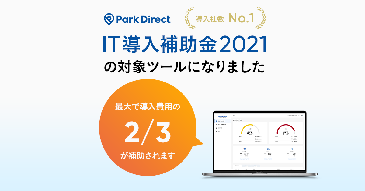 また本年、Park DirectはIT導入補助金2021の対象ツールに認定されました。本補助金を活用することで、導入費用を最大3分の1に抑えることが可能となりました(現在は申請を受け付けておりません)。