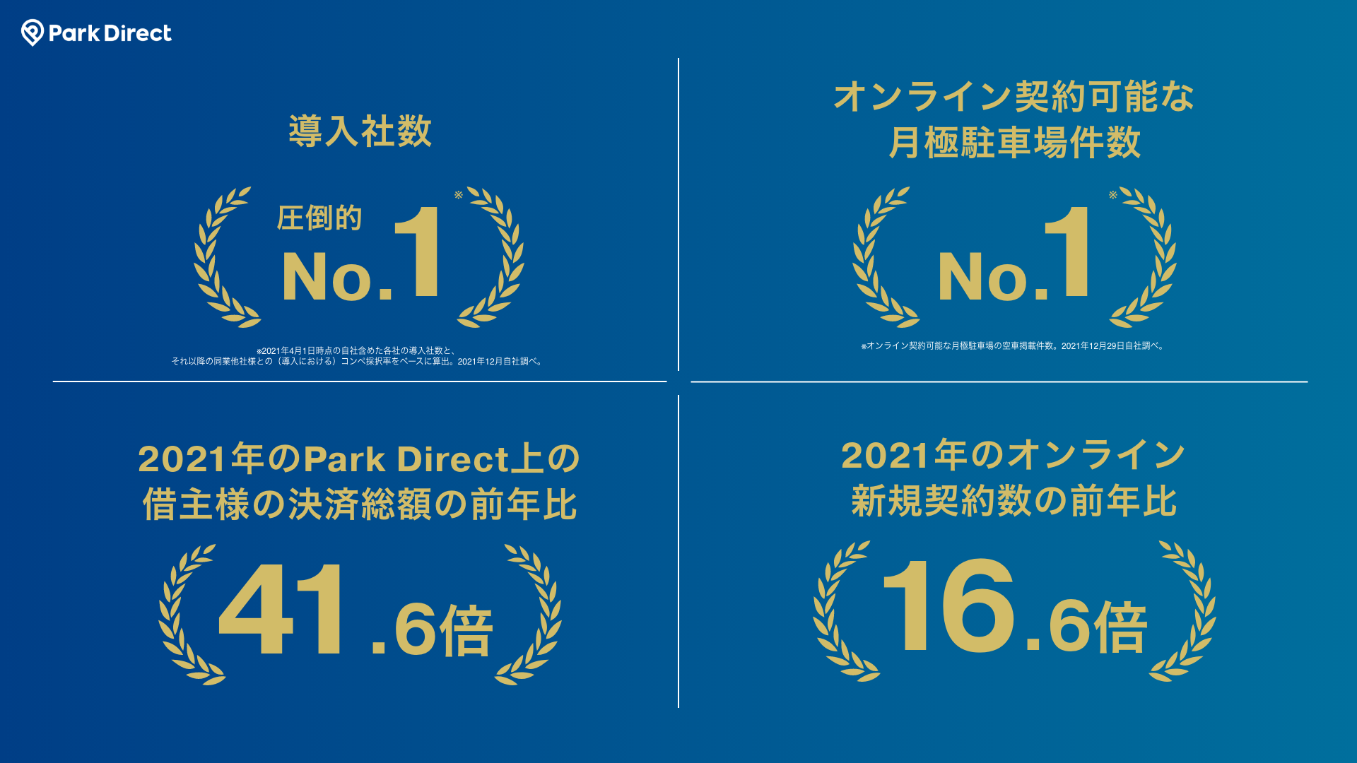 (※4)導入社数、掲載台数(オンライン契約可能な駐車場の掲載台数合計。満車含む)、導入台数(Park Direct導入済駐車場の台数合計(非公開台数含む))において。2021年3月自社調べ。