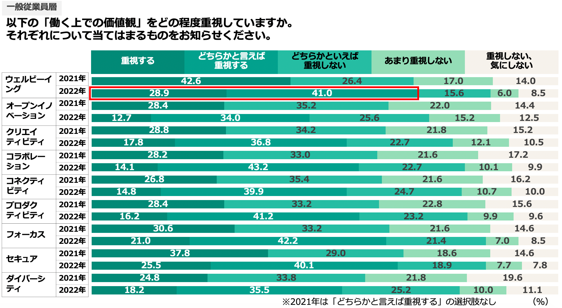 11. 一般従業員が働く上での価値観として重視しているのは、昨年と同様「ウェルビーイング(69.9%) 」がトップにランクイン。昨年(42%)よりさらに上昇。コロナ禍長期化における心身の負担が高まっていることが、ウェルビーイングを価値観として重要視する従業員が増加していることからも明らかになった。