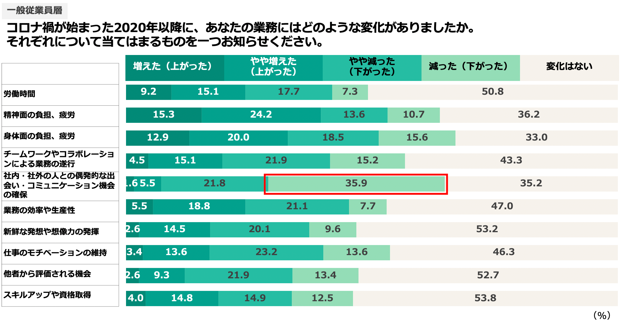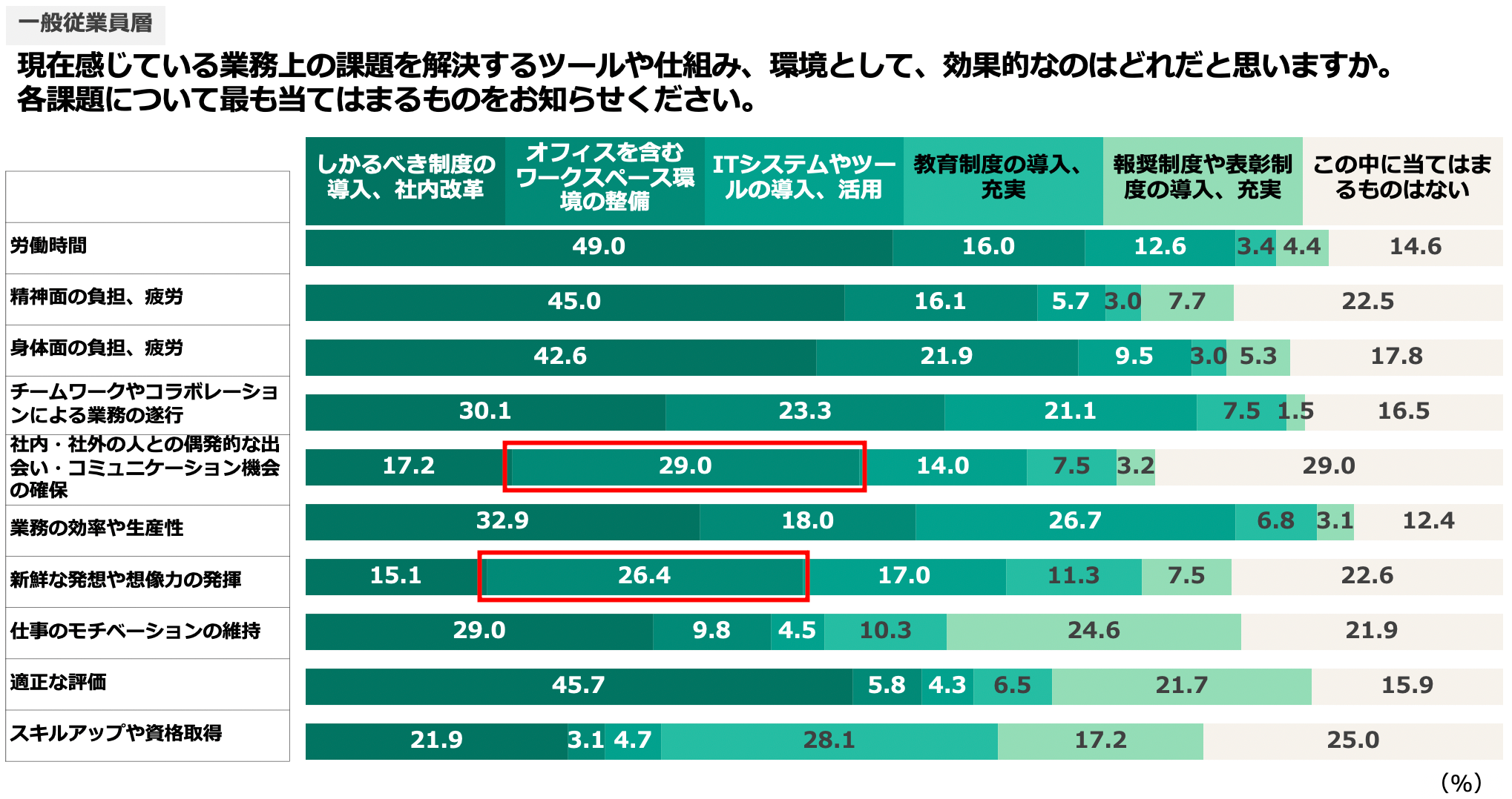 12. コロナ禍が始まった2020年以降、一般従業員の業務内で「社内・社外の人との偶発的な出会い・コミュニケーション」が減った項目として、トップに(57.7%)。また、「社内・社外の人との偶発的な出会い・コミュニケーション機会の確保(29%)」および「新鮮な発想や想像力の発揮(26.4%)」に対する課題に対しては、「オフィスを含むワークスペース環境の整備」が解決策として最も効果的だと感じていることがわかり、今後、働く空間が益々重要視されていくと考えられる。